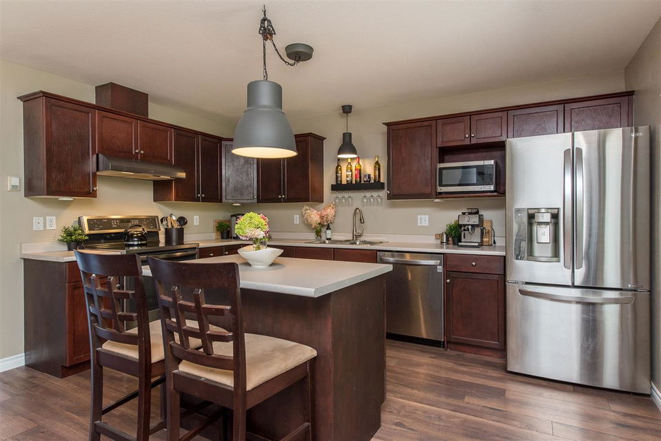 END UNIT BACKING GREENSPACE! This small 6 unit complex of 3 duplex buildings is “attached living” at it’s FINEST! Backing onto the ‘Bridlewood Nature Park’, this location offers extreme privacy, amazing VIEWS, & ample parking. No “complex feel” here with street parking out front & lane access to the DOUBLE GARAGE at the back! 2017 sq ft w/ 4 bdrms & 3 baths. Main floor features updated laminate flooring, modern paint, & beautiful kitchen w/ SS appliances (2017). Large covered patio off the kitchen for year round enjoyment of the nature & mountain views. BRAND NEW CARPETS leading up to and including the upper level 3 bdrms. The finished bsmt includes a 4th bdrm area, storage, & access to the LARGE garage. Great family spot only 3 blocks from Prom Elementary! Excellent Value!