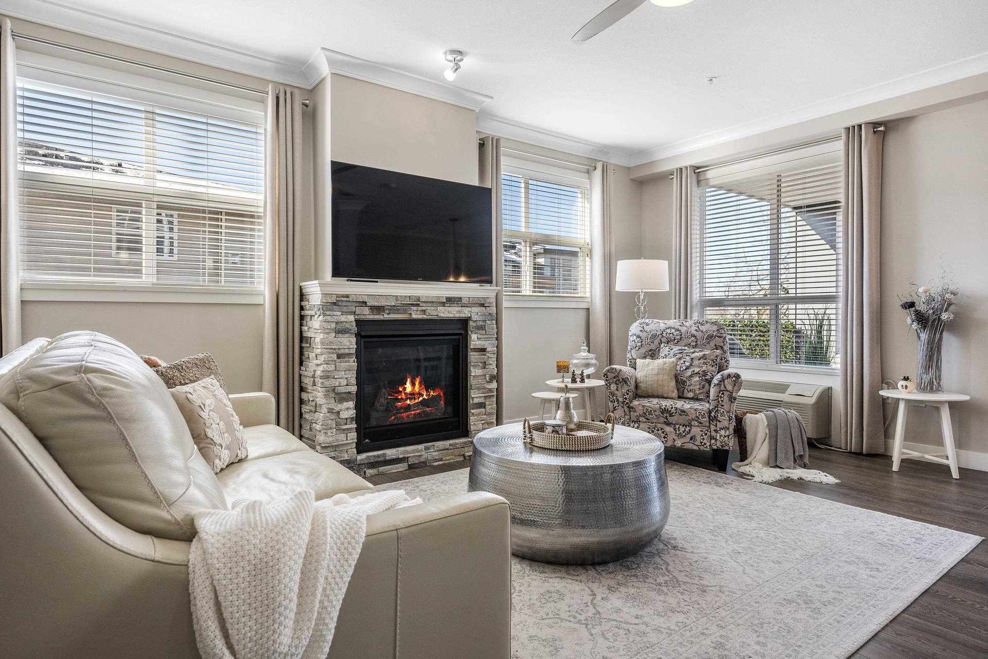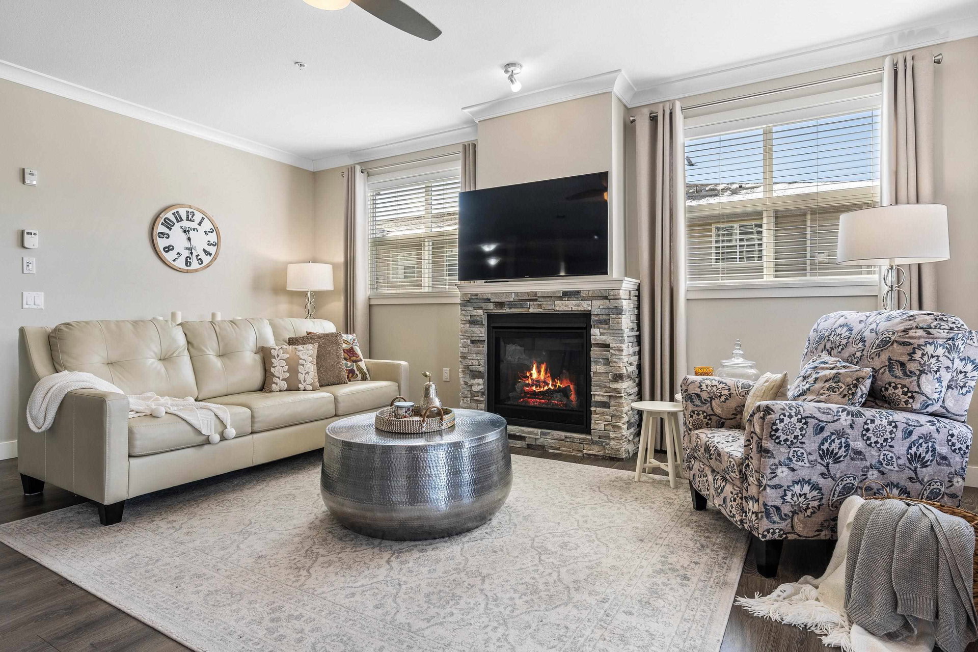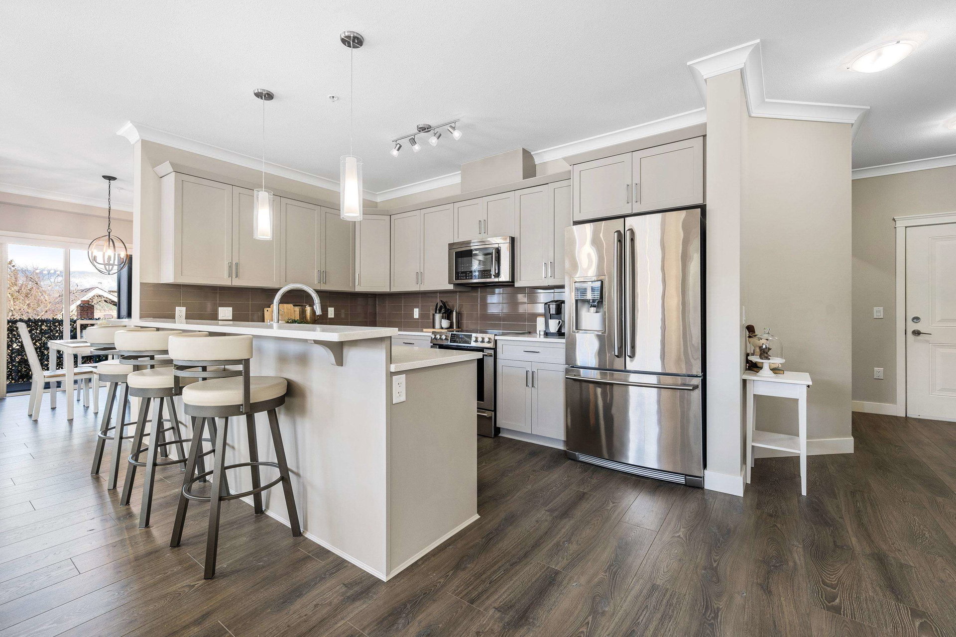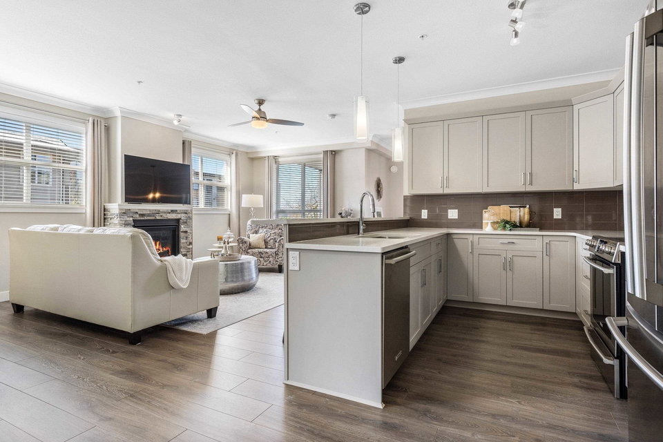 Welcome to The Boulevard. This S/W facing, Quiet & Peaceful condo is a corner unit with 9′ ceilings, gas fireplace, A/C, quartz counters & crown throughout. Laminate & tile flooring, a designer kitchen, Upgraded top of the line stainless steel appliances, including full size washer & dryer. Ample cabinets, pantry, counter space & eat at bar. Luxurious ensuite & custom cabinetry in Master bdrm closet. An inviting extra large private balcony viewing onto trees & mountains. The building offers upgraded soundproofing, secure parking, storage lockers, bike rm, fitness & meeting rooms. Walk to the new District 1881, shopping, dining, medical, Leisure Centre and Cultural Arts Centre.
