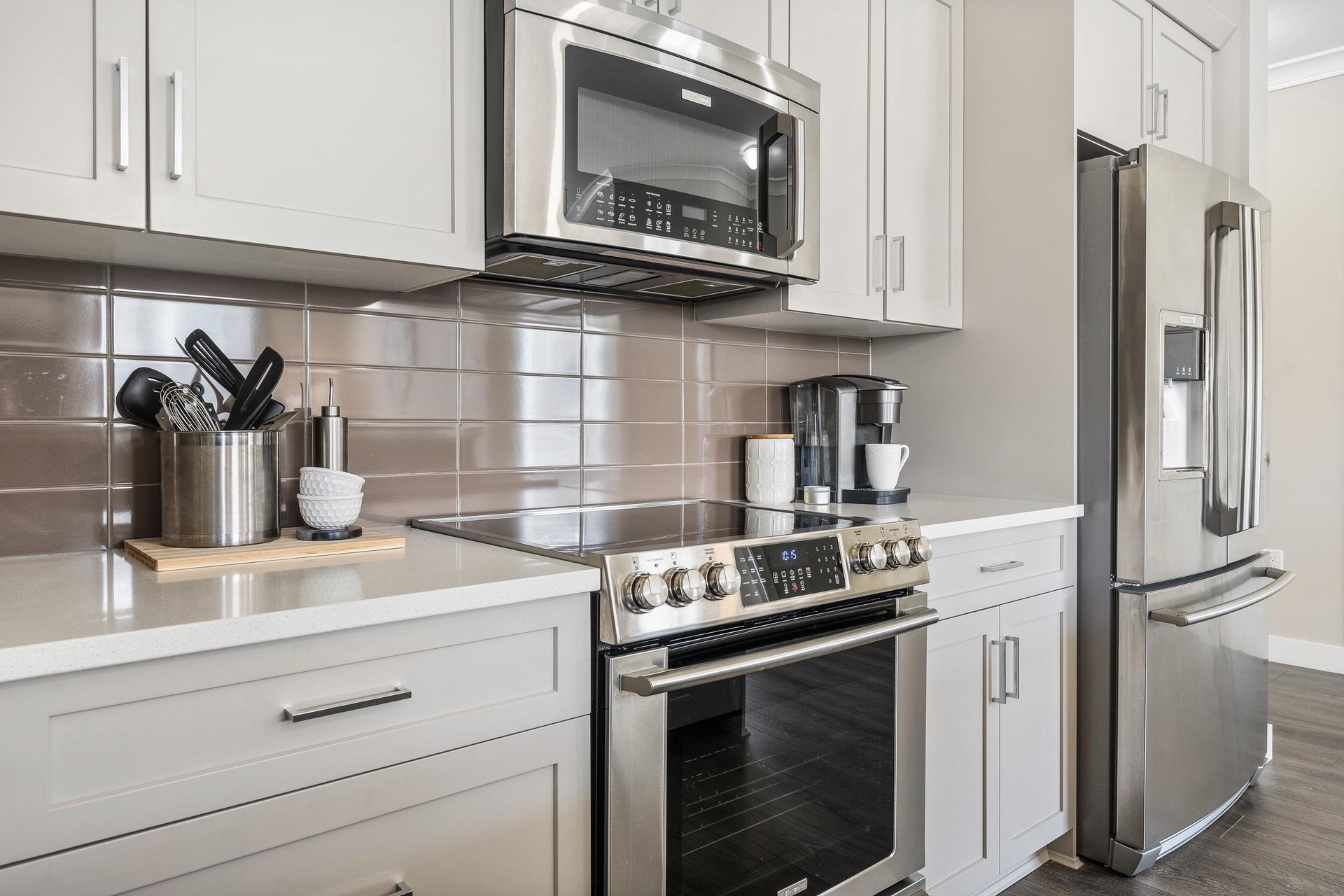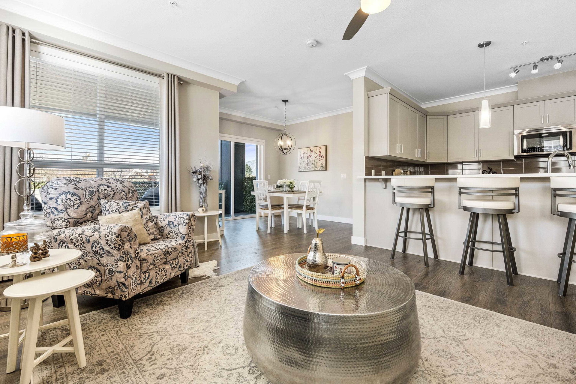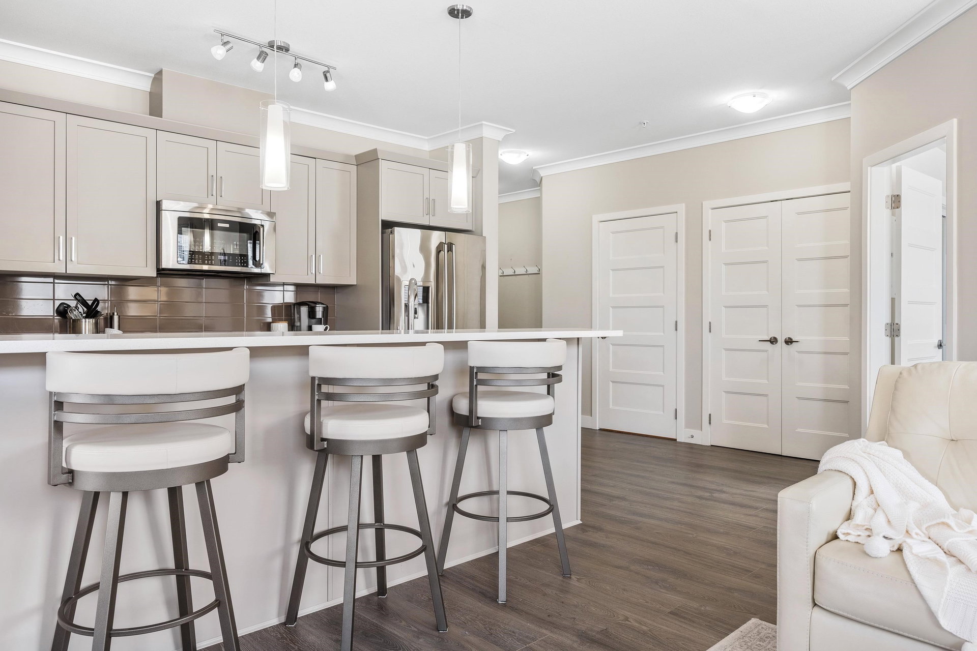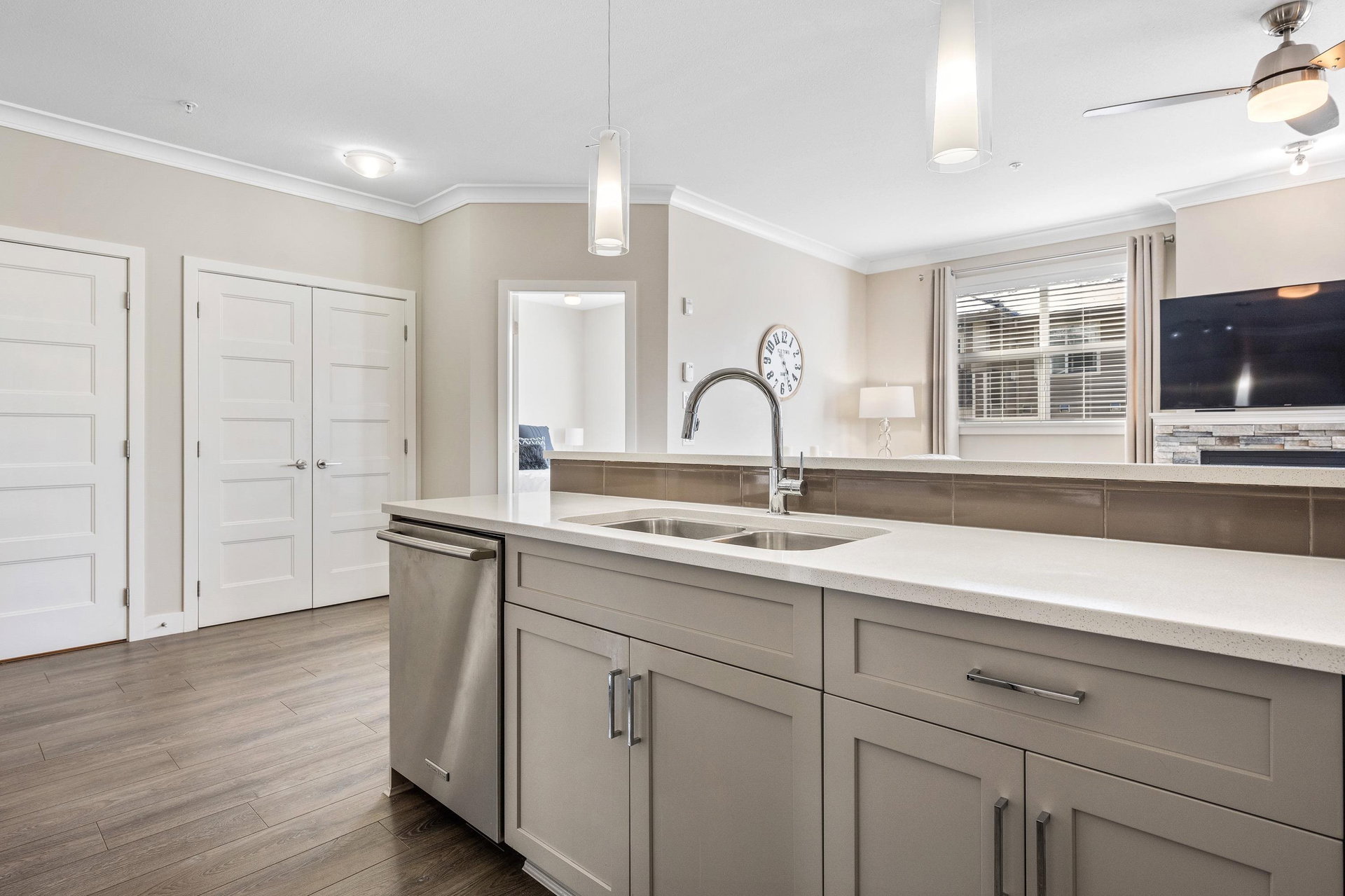 Welcome to The Boulevard. This S/W facing, Quiet & Peaceful condo is a corner unit with 9′ ceilings, gas fireplace, A/C, quartz counters & crown throughout. Laminate & tile flooring, a designer kitchen, Upgraded top of the line stainless steel appliances, including full size washer & dryer. Ample cabinets, pantry, counter space & eat at bar. Luxurious ensuite & custom cabinetry in Master bdrm closet. An inviting extra large private balcony viewing onto trees & mountains. The building offers upgraded soundproofing, secure parking, storage lockers, bike rm, fitness & meeting rooms. Walk to the new District 1881, shopping, dining, medical, Leisure Centre and Cultural Arts Centre.