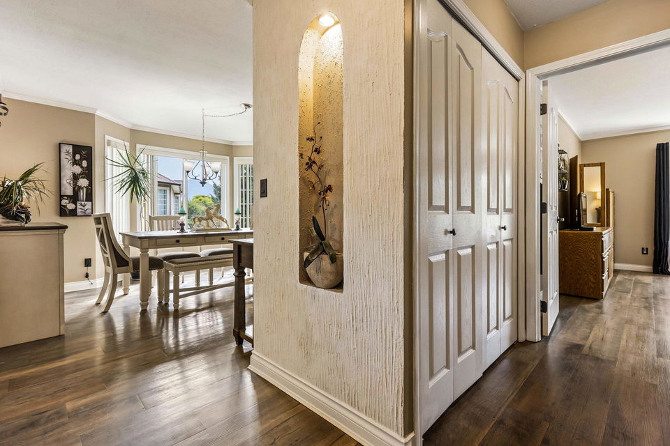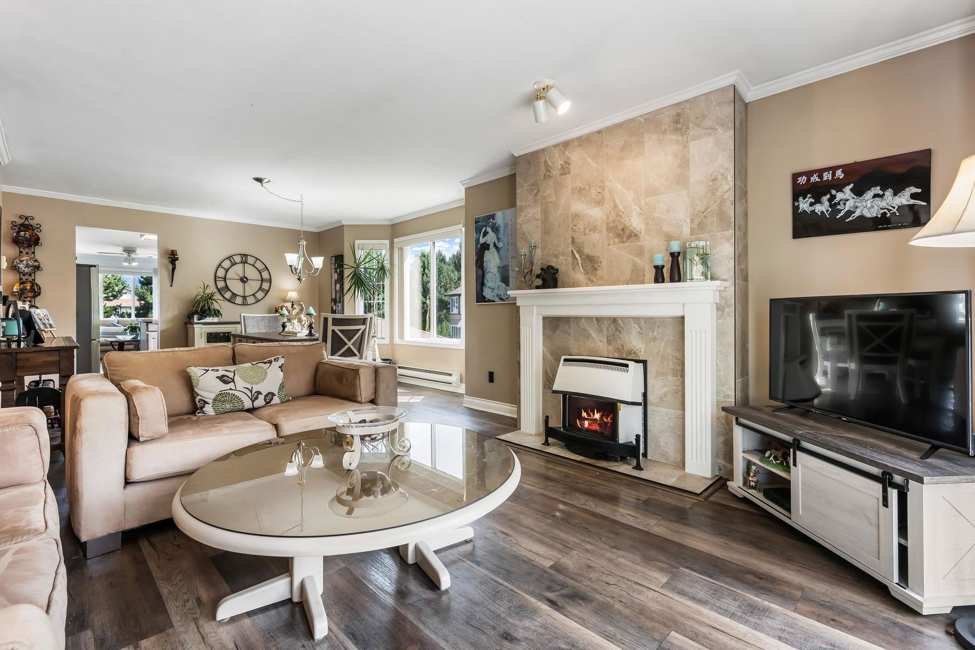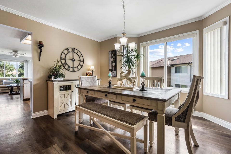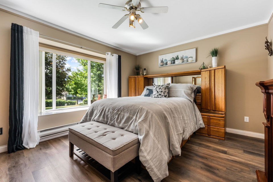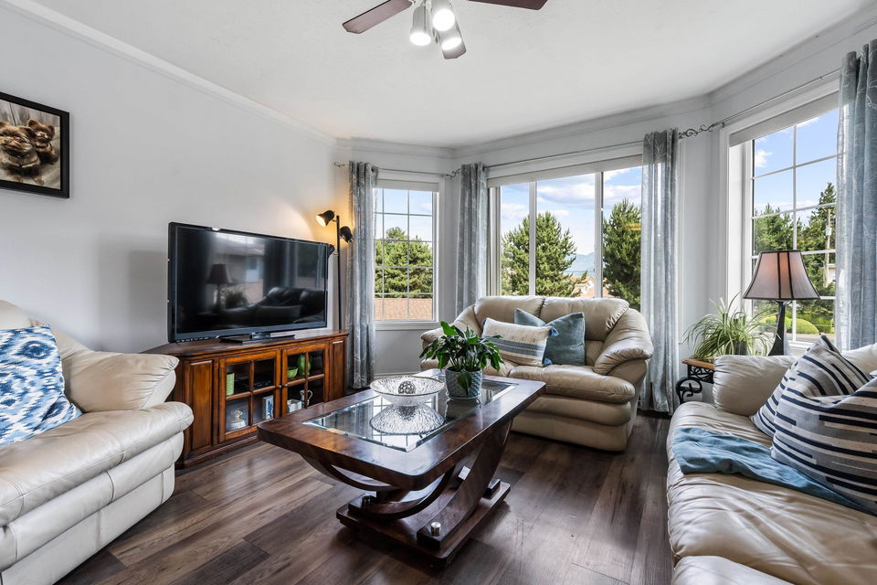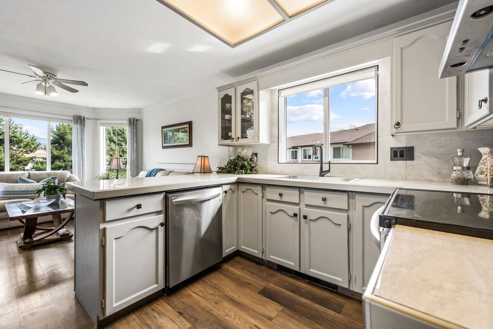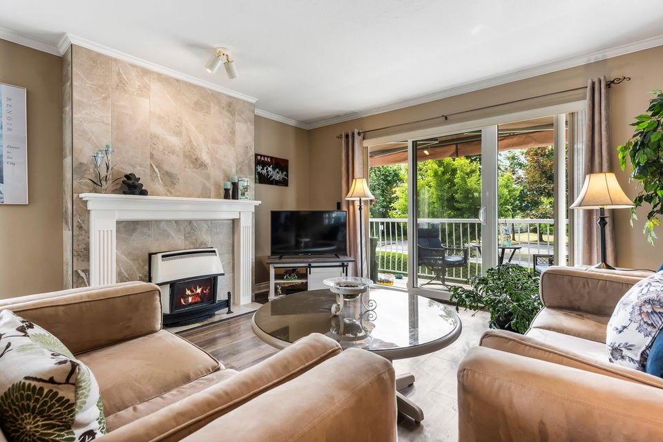 Beautifully maintained upper unit townhome in a peaceful 55+ age restricted community! Fabulous layout w/ 2 bedrooms & 2 bathrooms featuring tasteful updates throughout. Modern kitchen & lovely living room w/ bay window. Second living room has a cozy gas fireplace & access to the charming balcony overlooking greenspace! Spacious primary bedroom w/ walk in closet & renovated 3 pc ensuite w/ new vanity & walk in shower. Also including a secondary bedroom, full 4pc bath, in suite laundry, a carport parking stall & RV parking available! Central location close to shopping, transit & essential amenities!