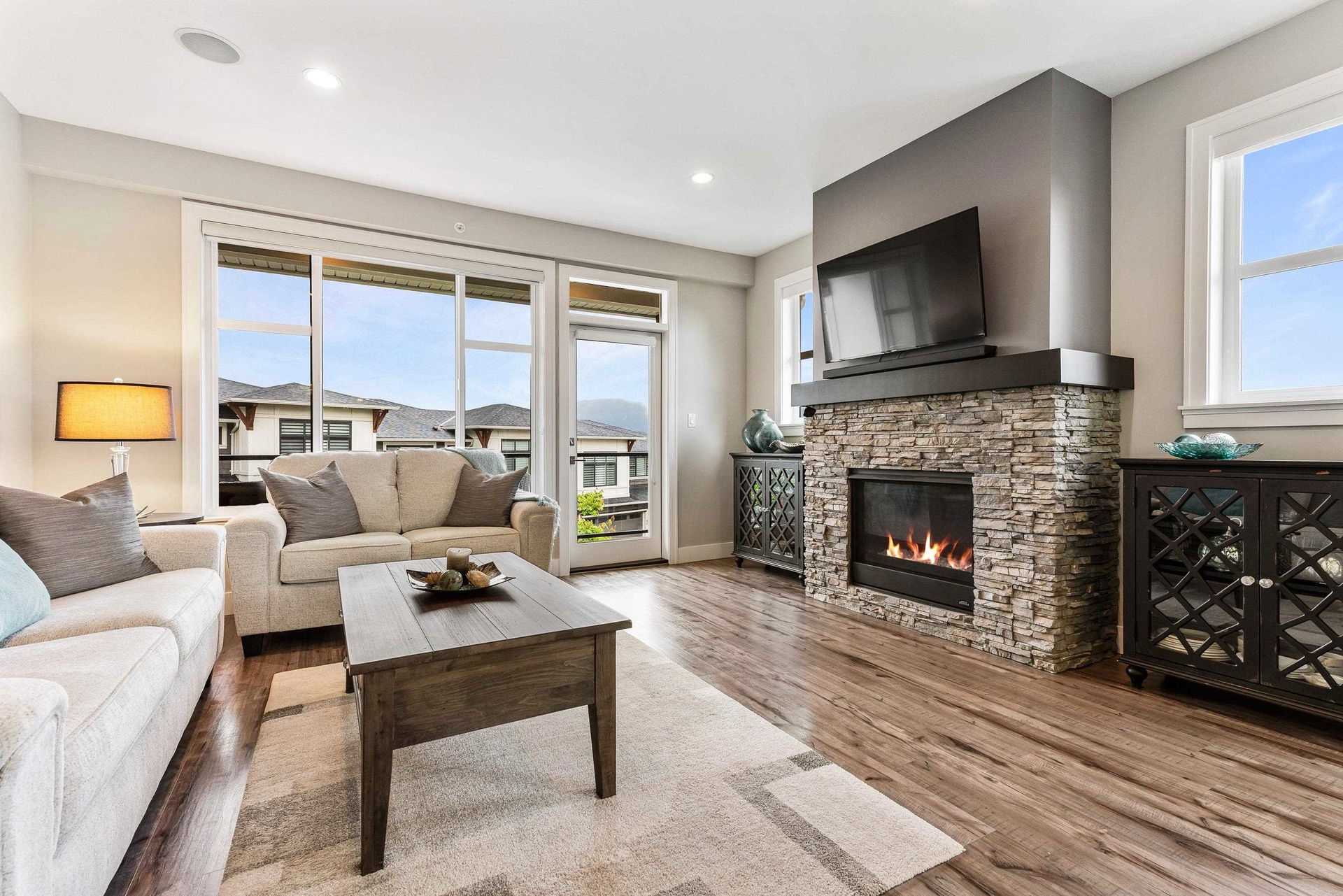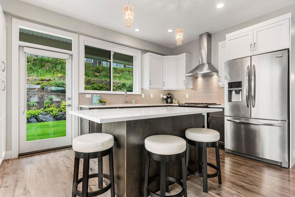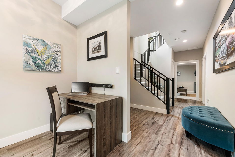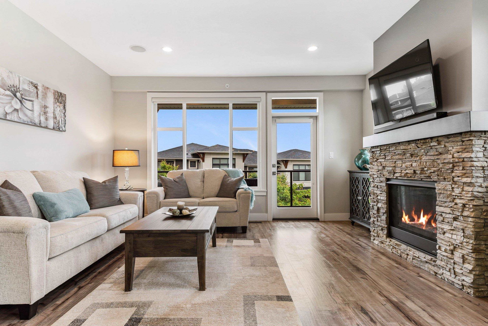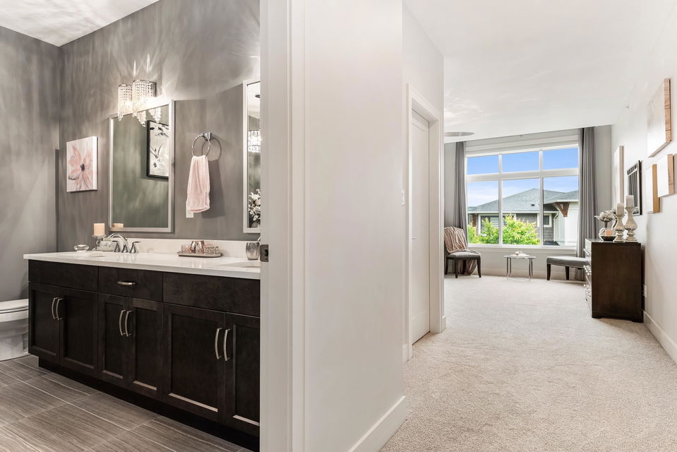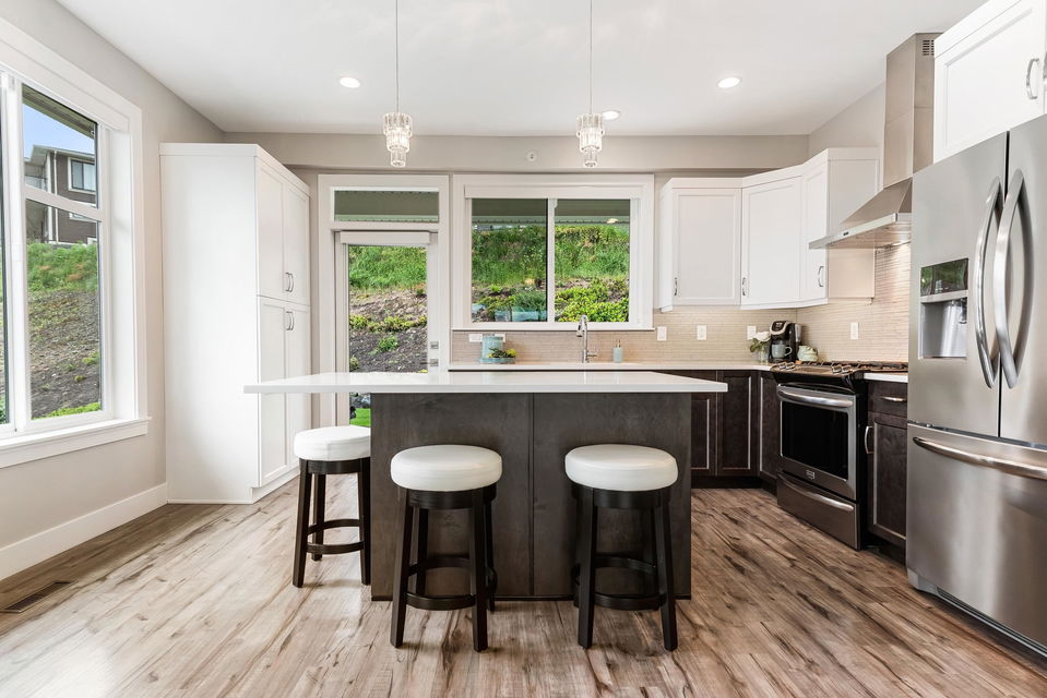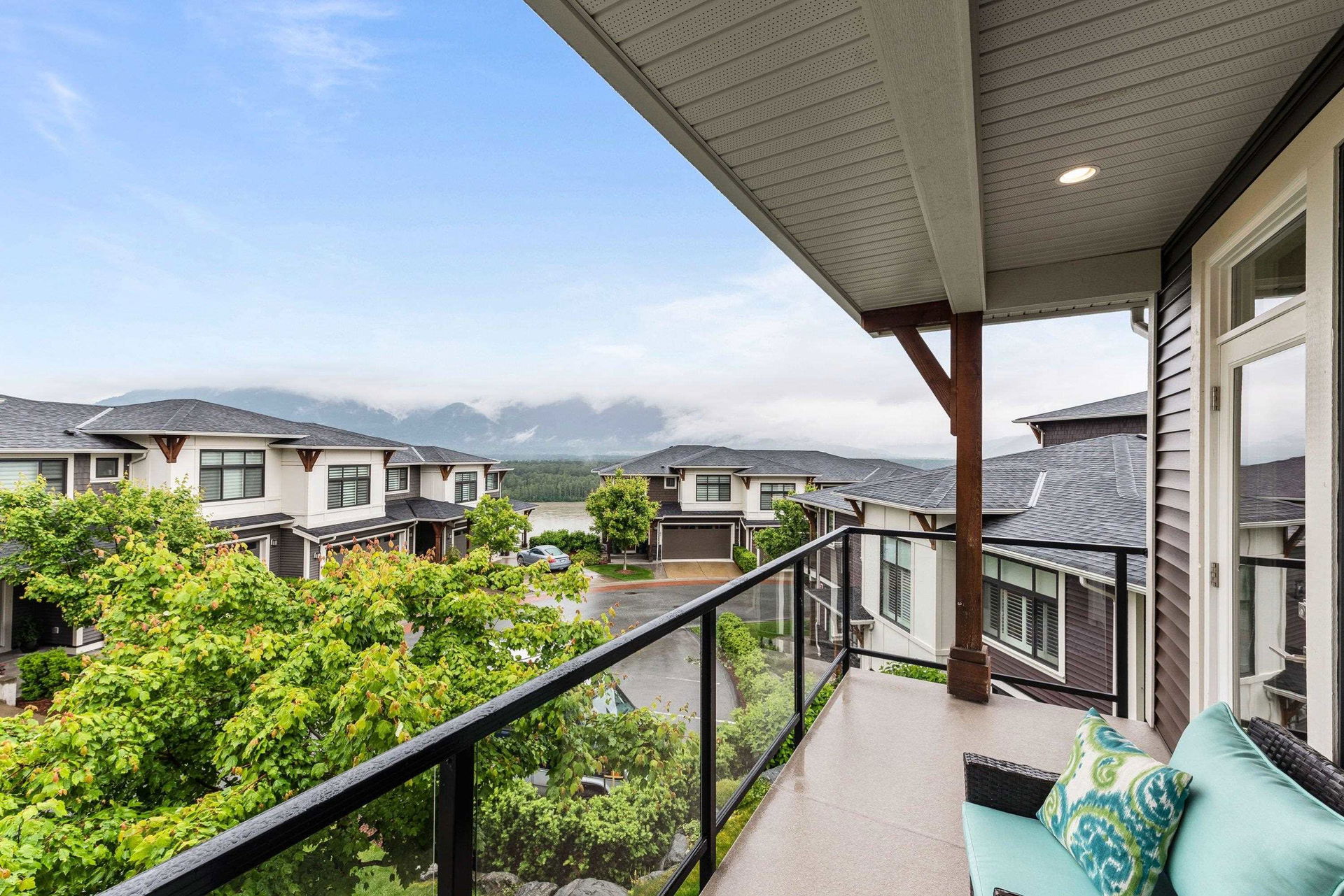 FRASER RIVER VIEWS! Welcome home and enjoy this 3 bdrm + den BRIGHT END UNIT w/ rare TRIPLE CAR GARAGE. Open concept high end kitchen w/ SS appliances, gas range, quartz counters, & b.i. pantry. Walk out access to a large covered patio w/ mountain & river views to the east. Spacious living room w/ rock faced gas fireplace & private patio w/ river views to the west to enjoy the gorgeous sunsets. Beautiful master bedroom w/ full 5 piece ensuite (dbl vanity & soaker tub) + a walk in closet! Entry level w/ welcoming foyer, office/den, and a large media room/ 3rd bedroom. Added highlights; central A/C, moisture proof laminate flooring, LED lighting throughout, Sonos speaker system, custom drapes in bdrms, b.i. vac, Heppa filter, & upgraded light fixtures, new carpets. Shows brand new & NO GST!