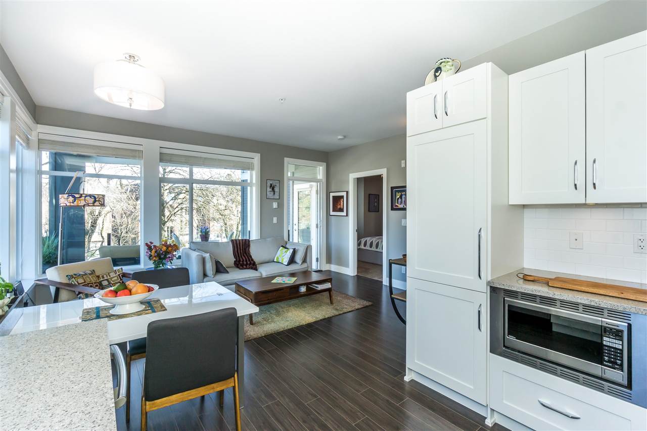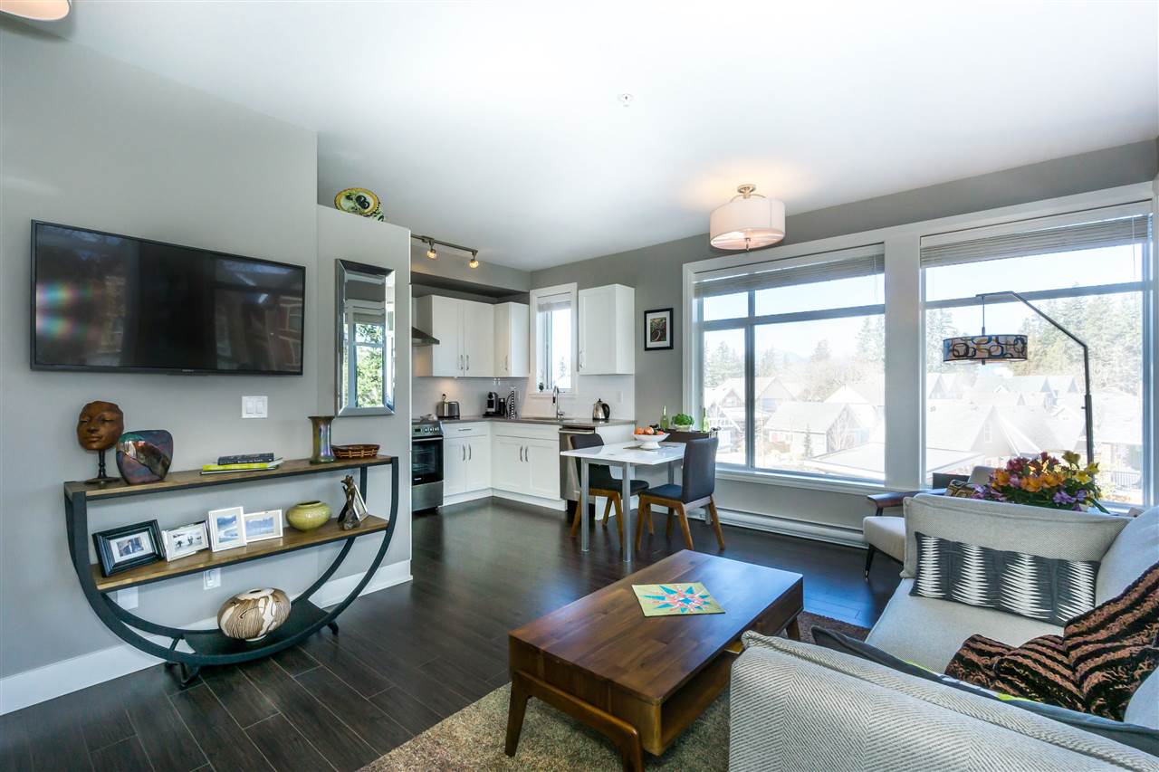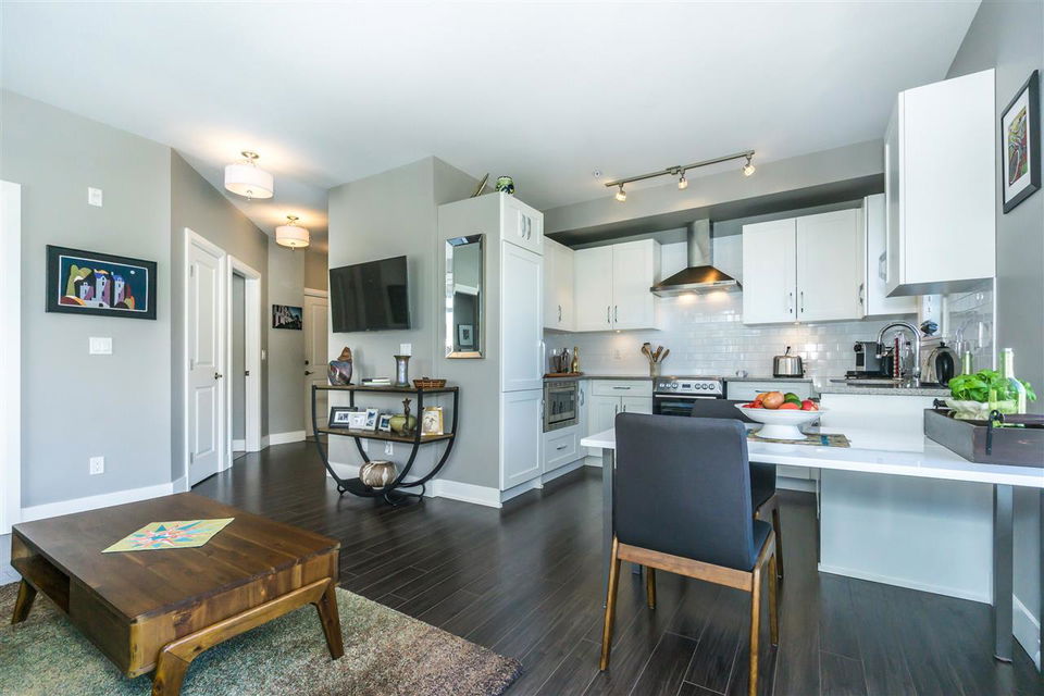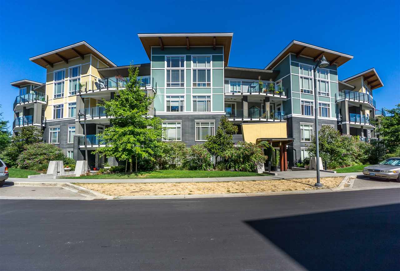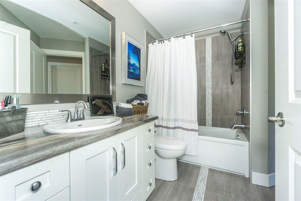 CORNER CONDO @ THE RADIUS in award winning GARRISON CROSSING. This gorgeous BRIGHT home features a massive covered patio overlooking the Boulevard & greenspace- a great location for year round enjoyment! Chic kitchen w/ SS appliances, quartz counters, tiled backsplash, undercabinet lights, & added pull out drawers (incl. spice rack!) for convenience. Master bedroom w/ added Pax wardrobe & jack and jill ensuite complete w/ soaker tub & tiled floors. Modern paint, 2″ faux wood blinds, high end laminate flooring, & 9′ ceilings. AMAZING building- steps to Garrison Village, UFV, & the Vedder River Trail! Guest suite, storage locker, & underground parking. Low $174/month strata fees, all ages, rentals, & pets allowed.