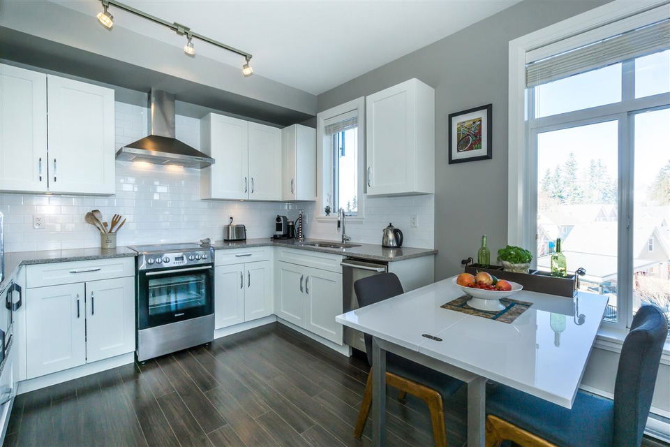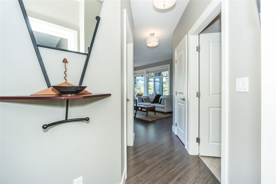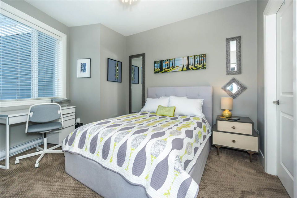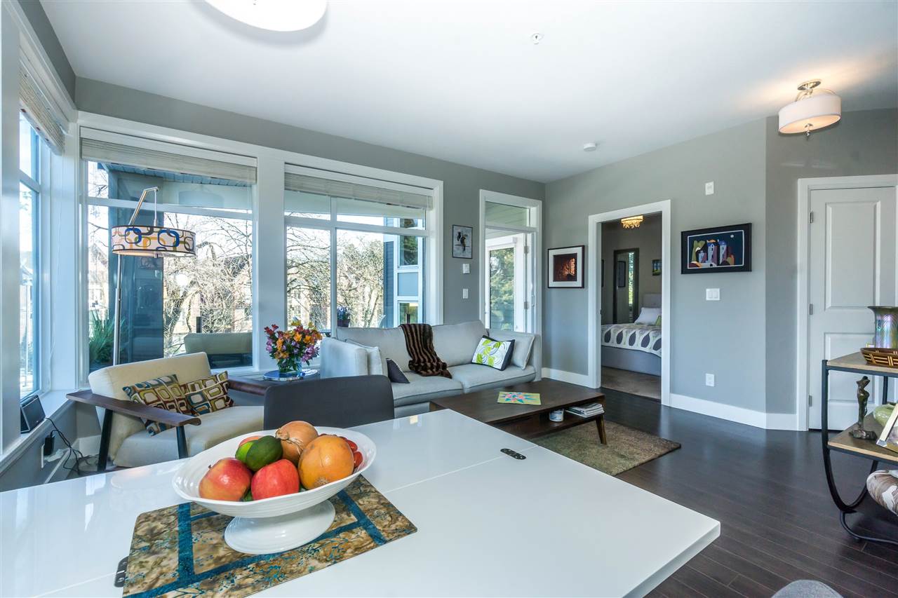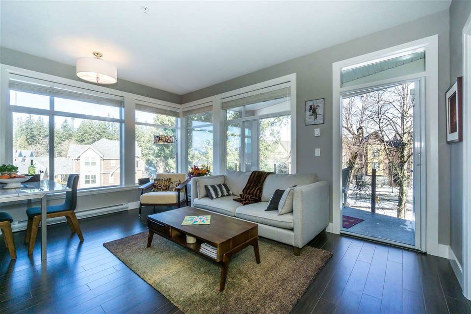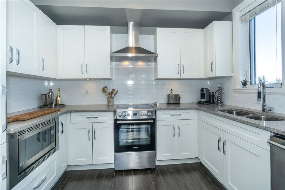 CORNER CONDO @ THE RADIUS in award winning GARRISON CROSSING. This gorgeous BRIGHT home features a massive covered patio overlooking the Boulevard & greenspace- a great location for year round enjoyment! Chic kitchen w/ SS appliances, quartz counters, tiled backsplash, undercabinet lights, & added pull out drawers (incl. spice rack!) for convenience. Master bedroom w/ added Pax wardrobe & jack and jill ensuite complete w/ soaker tub & tiled floors. Modern paint, 2″ faux wood blinds, high end laminate flooring, & 9′ ceilings. AMAZING building- steps to Garrison Village, UFV, & the Vedder River Trail! Guest suite, storage locker, & underground parking. Low $174/month strata fees, all ages, rentals, & pets allowed.