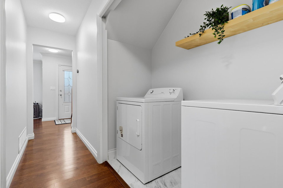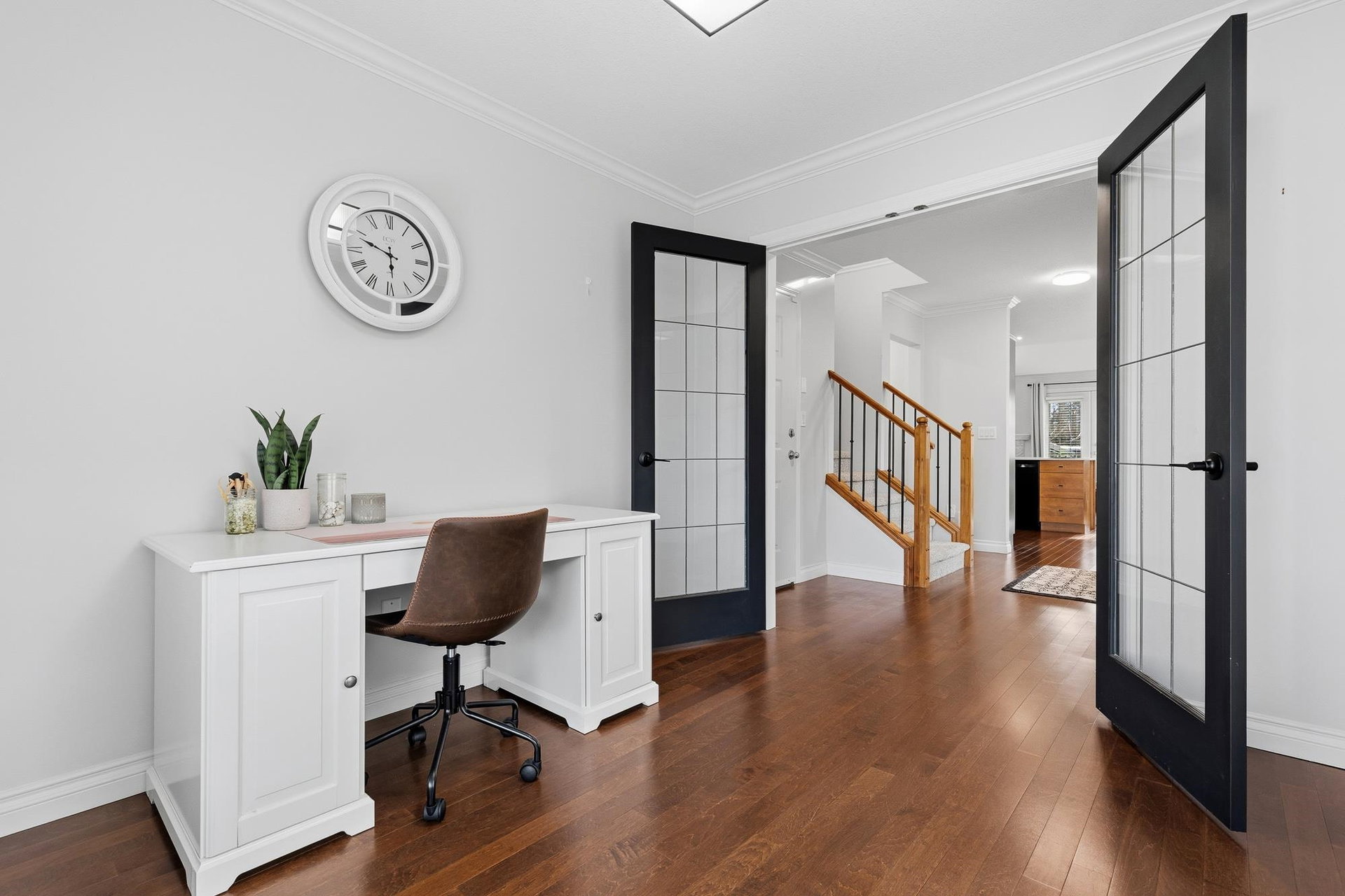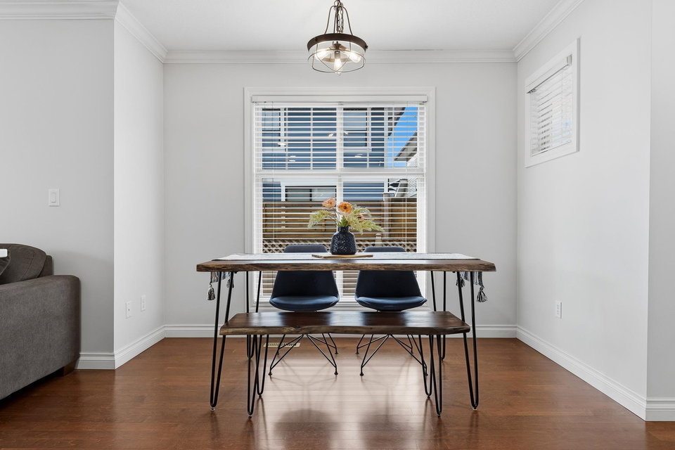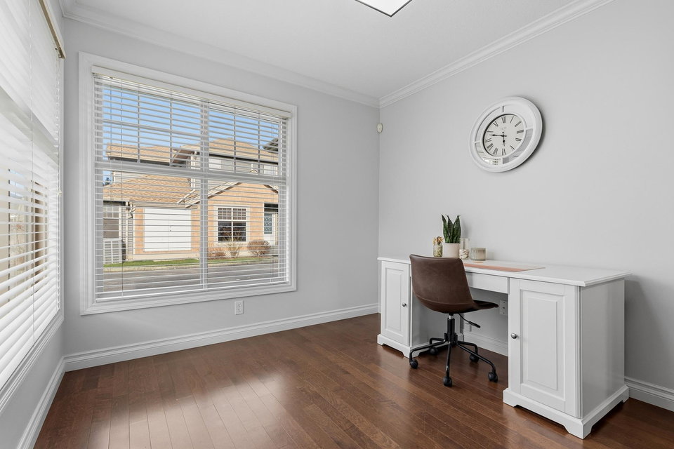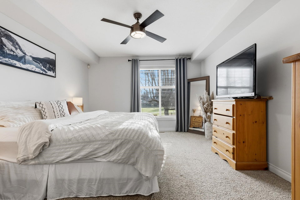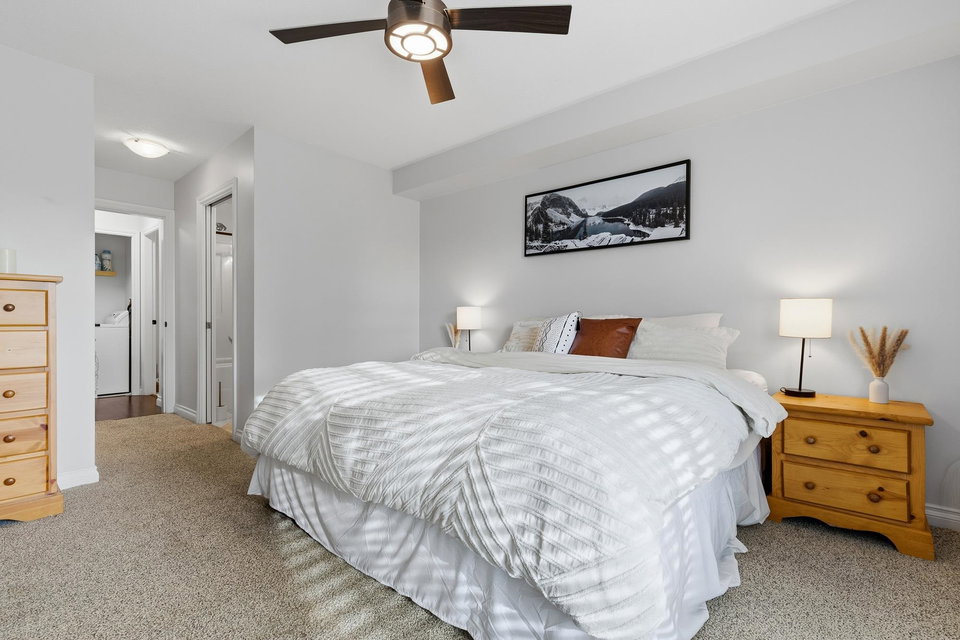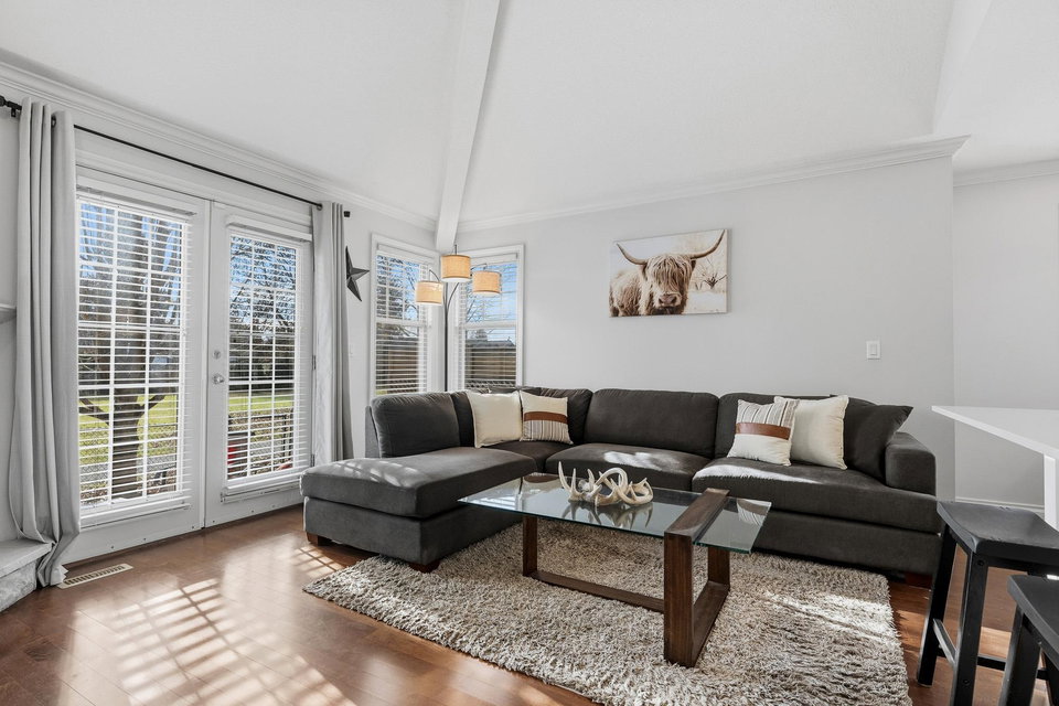 UPDATED MASTER ON MAIN END UNIT townhome backing onto BONNY PARK on QUIET Riverside Drive! All living on ONE LEVEL with an updated KITCHEN (new Quartz C/Tops, Backsplash & Fixtures!), Hardwood floors, Modernized N/G Fireplace all with Sunny SOUTHERN exposure bringing in NATURAL LIGHT! Main floor Primary bedroom featuring a spacious walk in closet + 4 piece ensuite, supported by a second bedroom or Den option for a home office or visitors. Upstairs has a large loft/living area with another 2 beds & FULL bathroom. Recent updates include CUSTOM wainscotting + NEW AC Unit! Great parking available with large Double garage, full length driveway & abundance of visitor parking in this sleepy 9 unit complex. Low density neighbourhood, fantastic access back to District 1881, amenities + HWY 1!