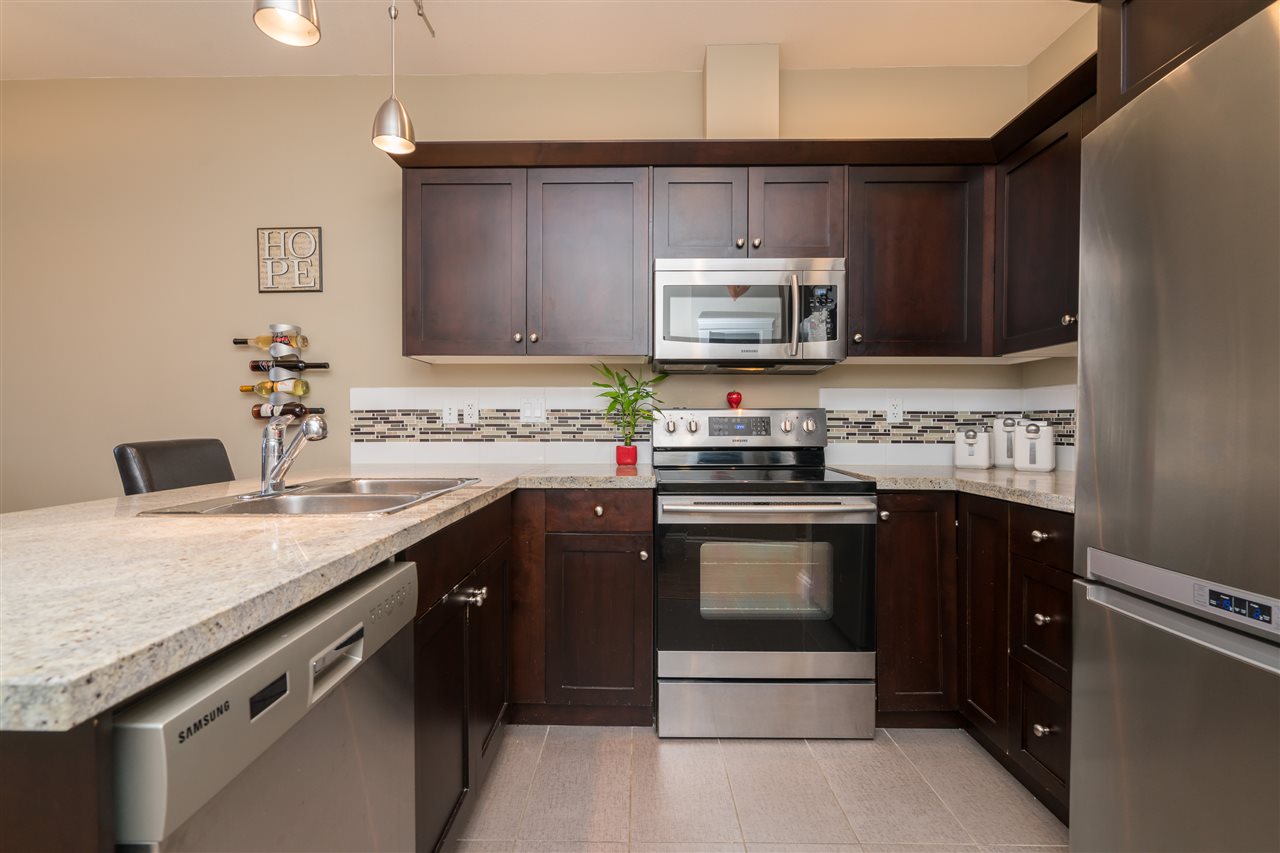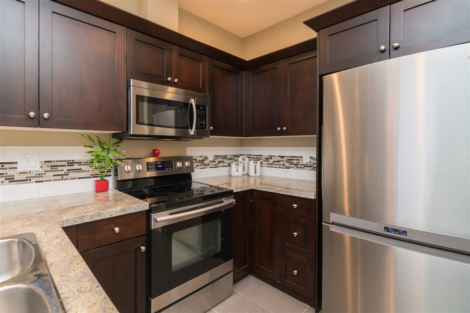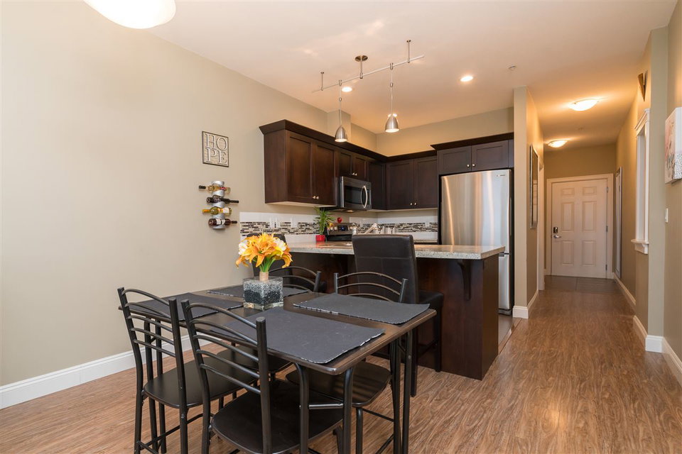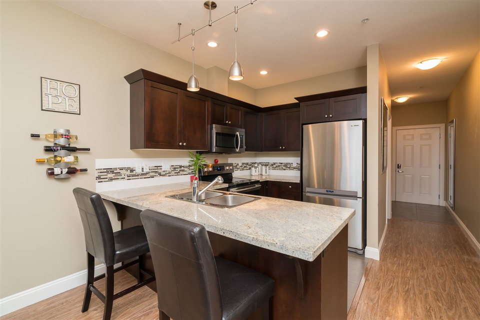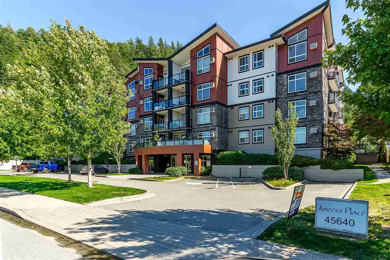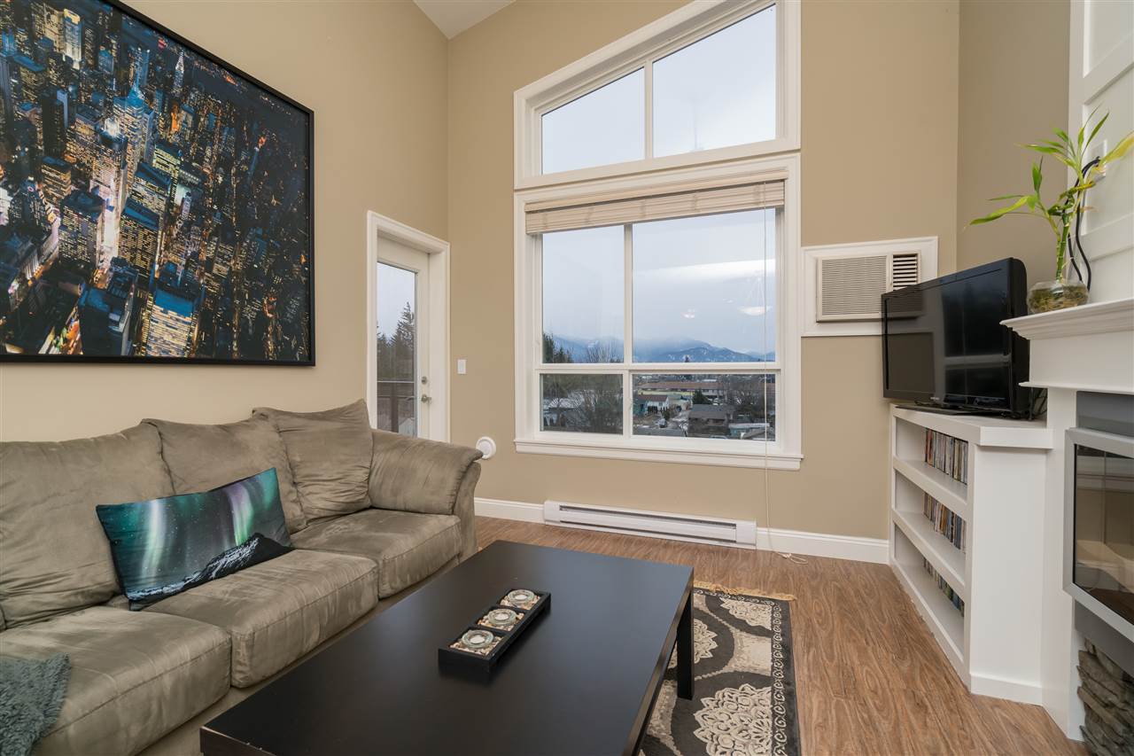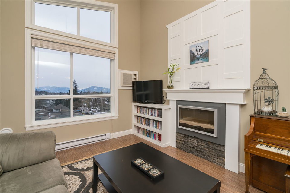 PENTHOUSE LIVING! Affordable and stylish- this 744 ONE BEDROOM & DEN top floor condo is STEPS to UFV, Garrison Crossing, & the Vedder River Trail, plus only a 5 min drive to Cultus Lake & Highway #1- the perfect investment in a booming area! Soaring 12′ ceilings with HUGE picture windows & a covered patio to enjoy the mountain views. A/C and a stylish fireplace feature w/ rock details & built in book shelving. Open concept kitchen w/ stainless steel appliances & granite countertops. Master bedroom w/ dual sided closets & ensuite washroom w/ tiled surround soaker tub. In suite laundry room w/ added storage PLUS a small den for a private office space. Great location IN the building & comes w/ a secure underground parking spot!