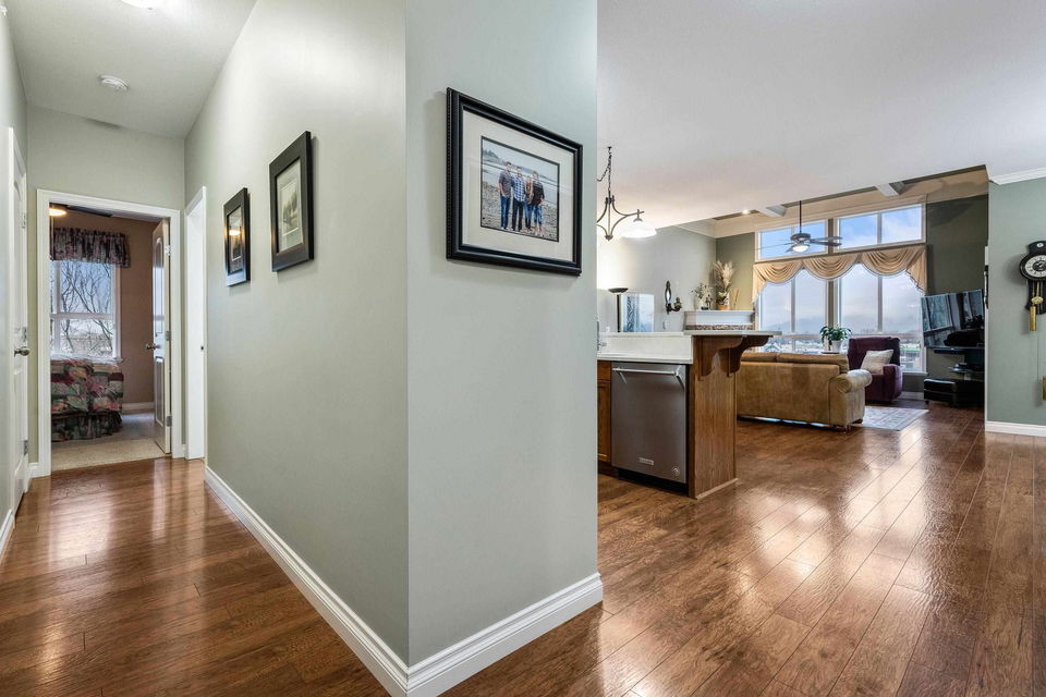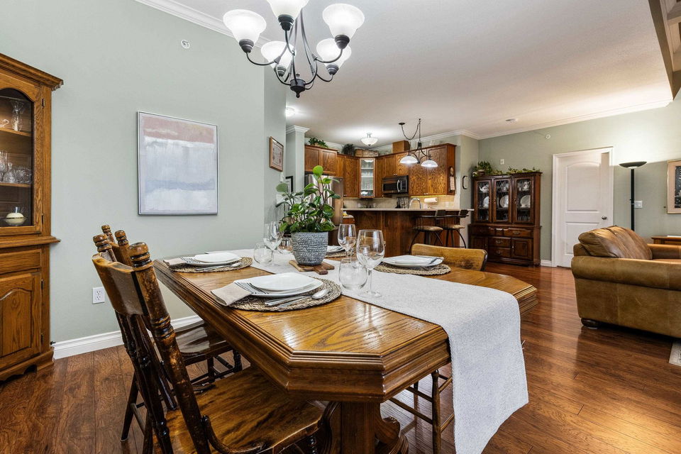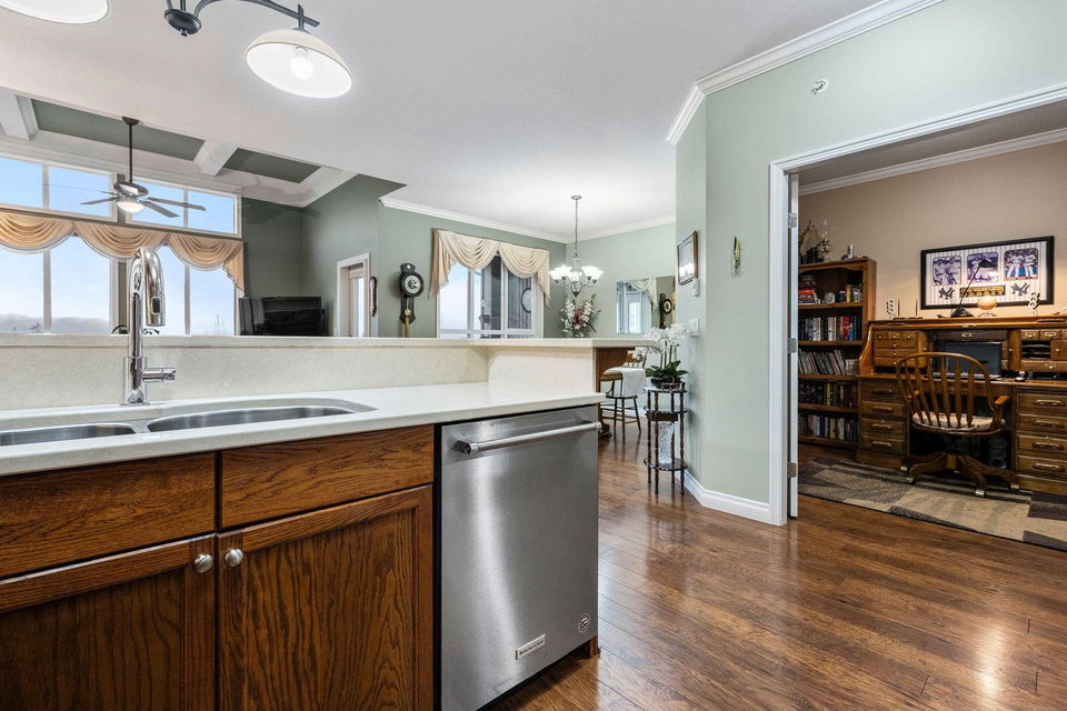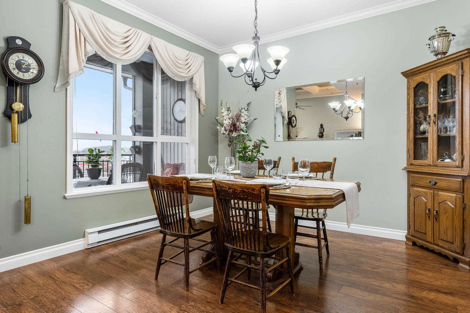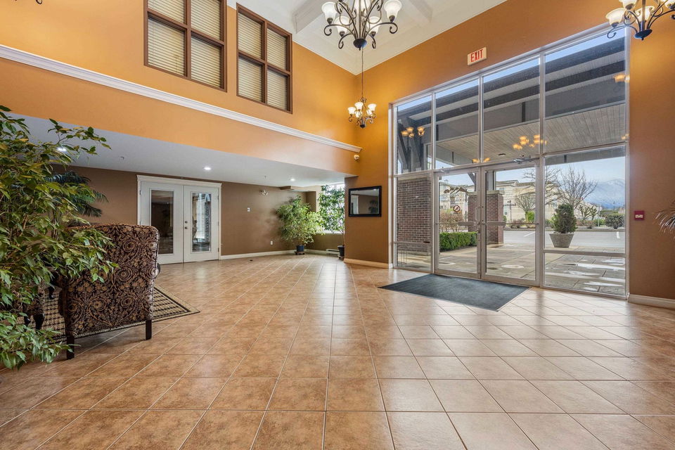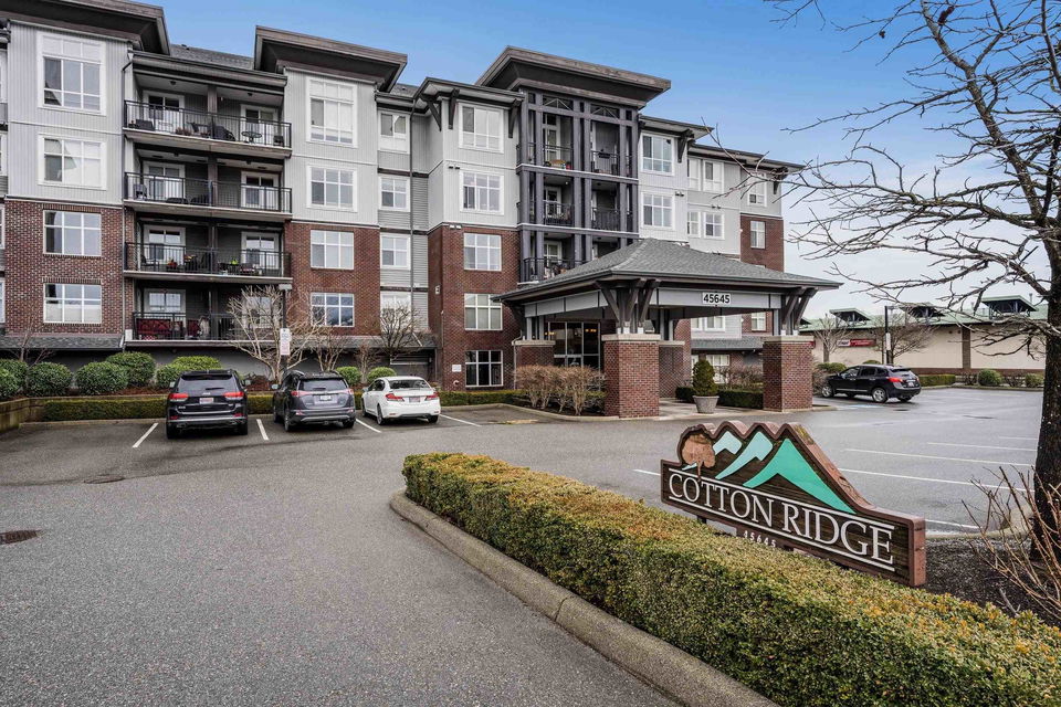 Penthouse Living! RARE find and first time on the market! This original owner 1,389 sq ft northwest corner suite is located in the highly sought after 55+ building of CottonRidge in Sardis. Amazing location STEPS to stores, doctors, restaurants, and walking trails! Immaculately kept, this home provides lovely laminate flooring, HIGH 9’ and 12’ ceilings, custom window coverings, and updated appliances throughout. The kitchen has been renovated with SS appliances and quartz counters. Oversized primary suite w/ full en suite featuring a newer custom shower, and a walk-in closet. Large in suite storage, den with Glass French doors, and one underground, secure, parking stall. Enjoy the mountain views from every window in your penthouse condo!
