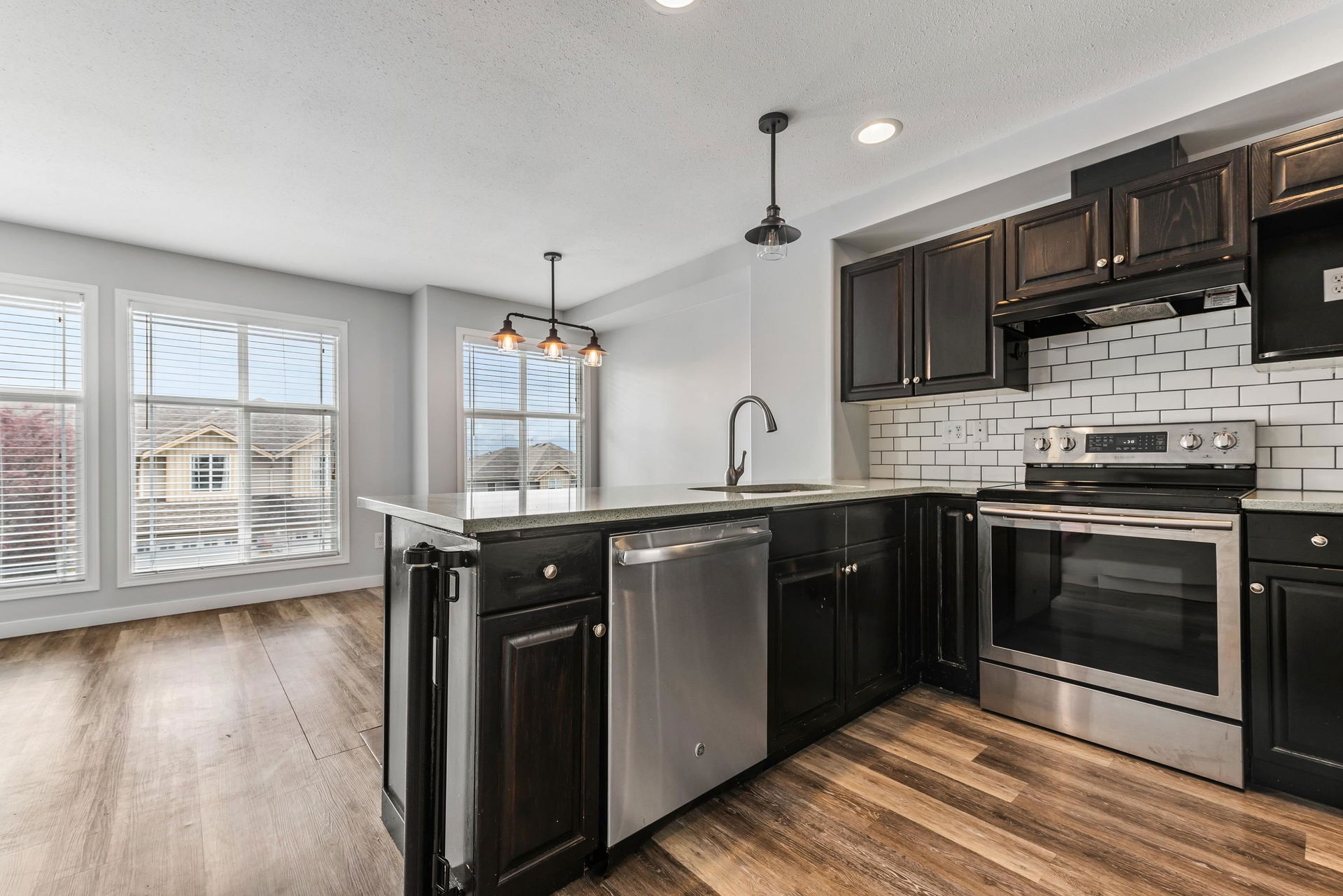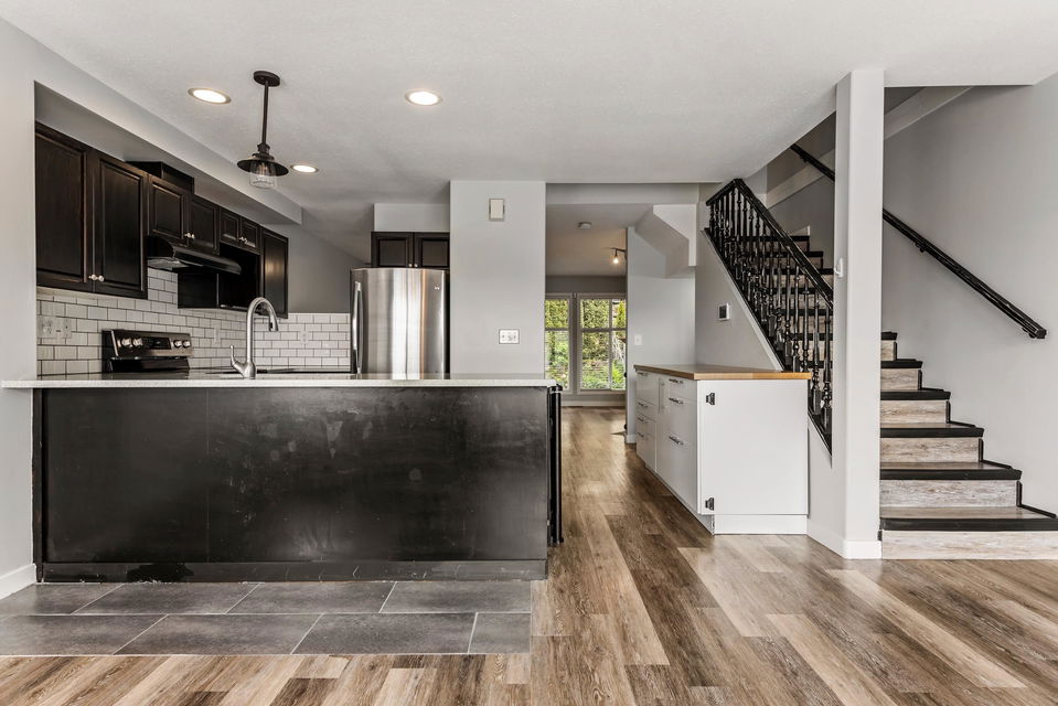 Renovated 3 bdrm & 3 bathroom townhome in popular Russell Heights! PRIVATE location@ the back of the complex offers a long flat driveway and a manicured hedged yard off the main floor- amazing layout! Large kitchen w/ SS appliances, QUARTZ counters, and built in sideboard storage. Dining area w/ valley views, spacious living room w/ new fireplace, & walkout access to the extended patio & yard. Vinyl plank flooring, modern paint, & updated fixtures. Upper level w/ 3 bdrms including master w/ walk-in closet & full ensuite! Single car garage w/ bonus den/ office at the rear with a 2 piece washroom. Great for a teen hangout, office, gym, or lady cave! Open to offers!!