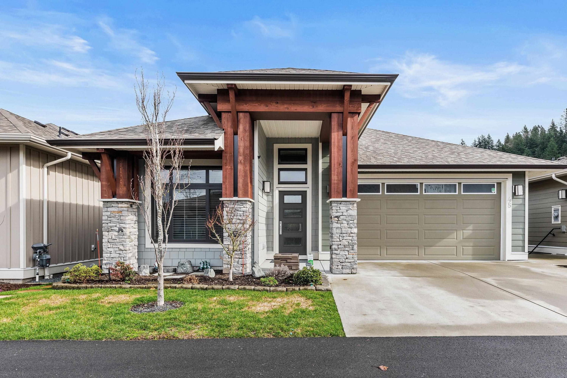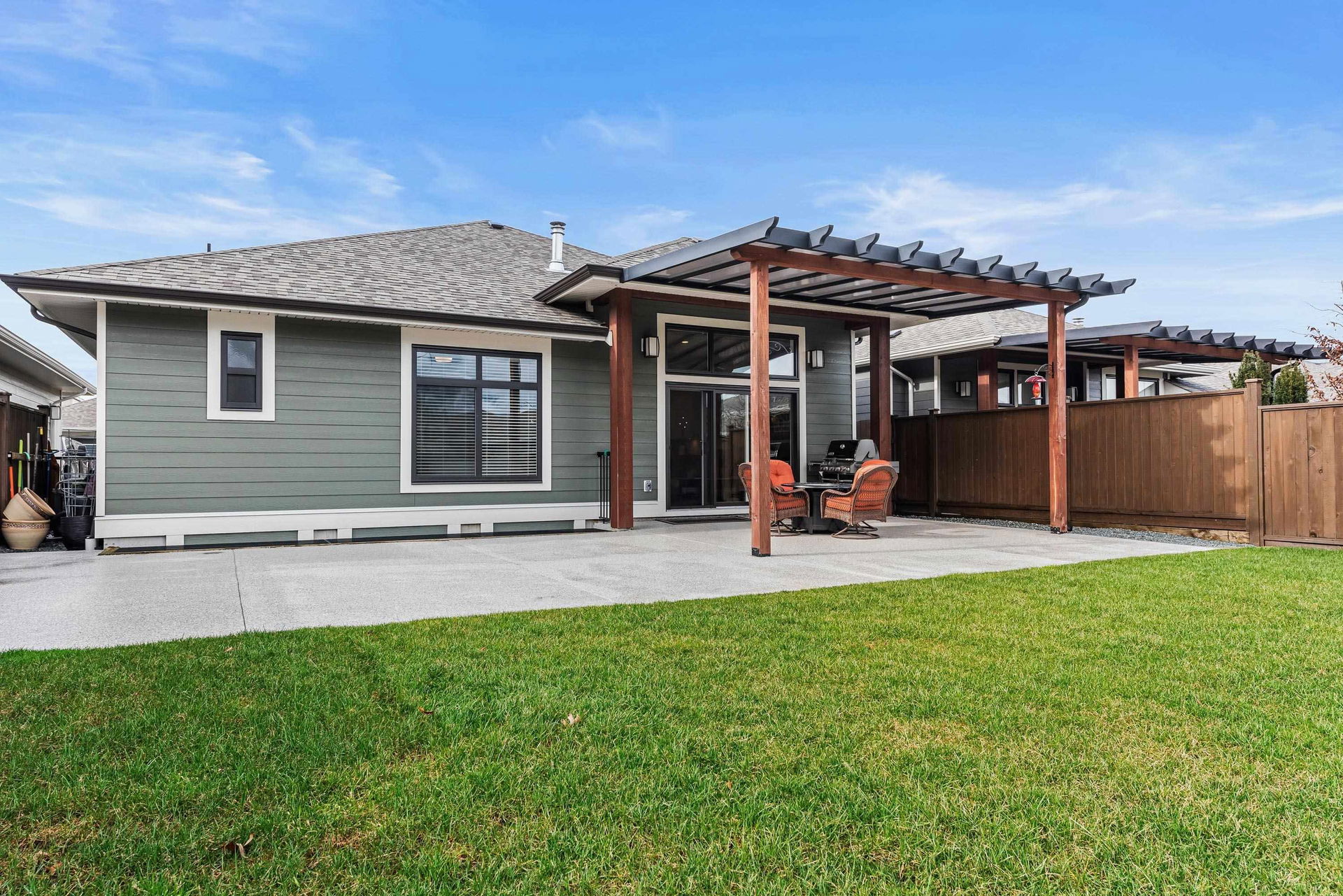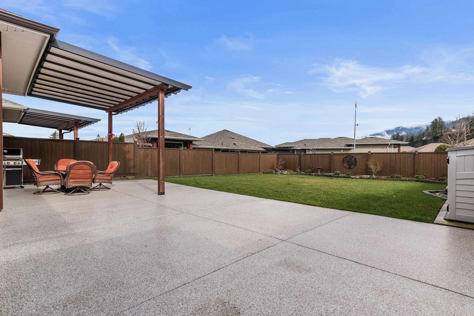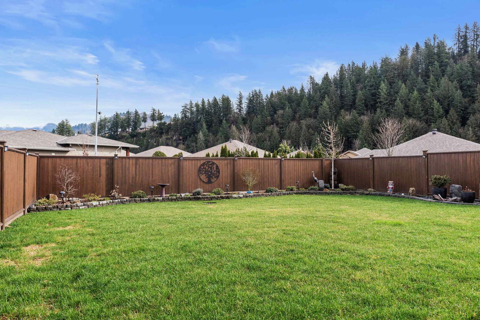 THOMAS CROSSING! This FREEHOLD beautiful RANCHER w/ BSMT sits on a LARGE fenced manicured 5702sq ft lot with a PRIVATE & scenic location featuring incredible MOUNTAIN VIEWS & afternoon southern sun. Crafted in 2018, you’ll love the modern finishes & AMPLE upgrades incl. a 40′ partially covered epoxy coated ENTERTAINMENT patio w/ gas BBQ line. Stunning kitchen w/ top of the line appliances, quartz counters, & large walk-in pantry. Spacious master w/ ensuite & w.i. closet, PLUS an open office/den w/ sunset views. FINSIHED BSMT w/ guest bdrm, full bathroom, large recreation space, hobby room, & unfinished storage area (great wine cellar!). Central A/C, hot water on demand, this home is LOADED and ready for a new owner! 45+ gated community only 5 mins to Vedder River & Garrison Crossing!