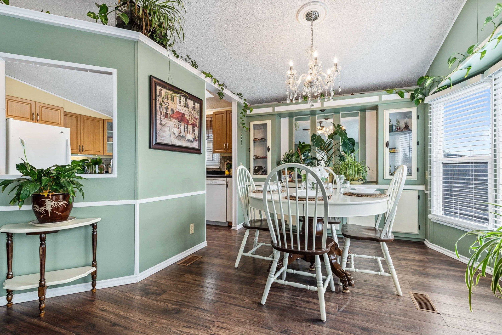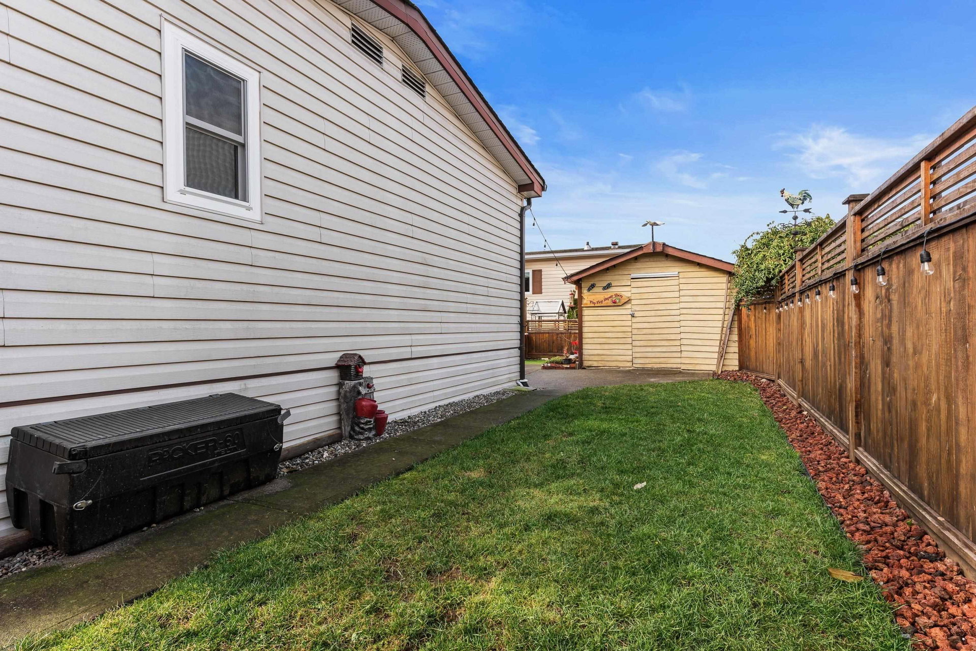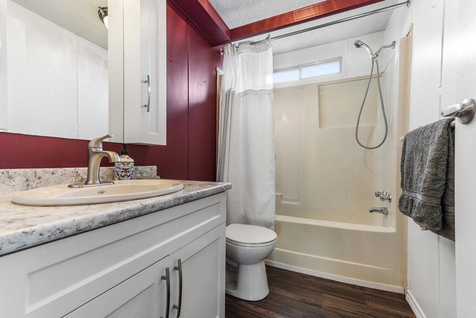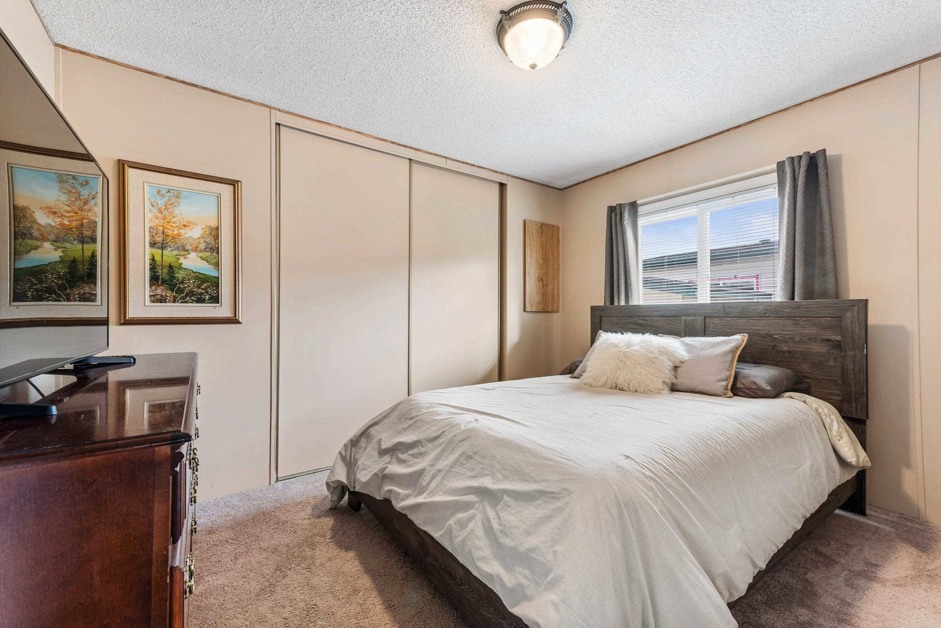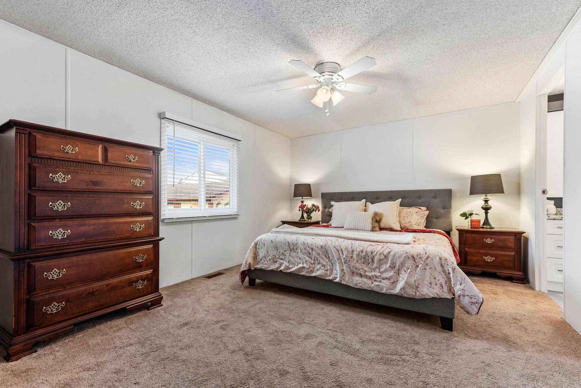 FABULOUS LOCATION in sought after RAINBOW ESTATES! This HUGE 1430 sq ft 2 bdrm plus den home is BRIGHT and has views of the southern mountains & greenspace in front! Upgraded throughout and TOTALLY MOVE-IN READY! Vinyl windows, updated flooring, modern paint, remodeled kitchen w/ nice cabnitry, & 2 renovated bathrooms. Lovely double wide layout w/ spacious kitchen w/ cut out into the living room. Master bdrm w/ private ensuite & ample closet space. Flex/.office space leads to an AMAZING 11×11 covered patio w/ access to the FULLY FENCED BACKYARD w/ powered 10×11 shed! Enjoy the afternoons & sunsets from the patio; the perfect place to sit & relax! Carport w/ dbl wide driveway. Central A/C. Complex RV parking, clubhouse, 40+ age restrictions, small dogs welcome. Only $220/month!