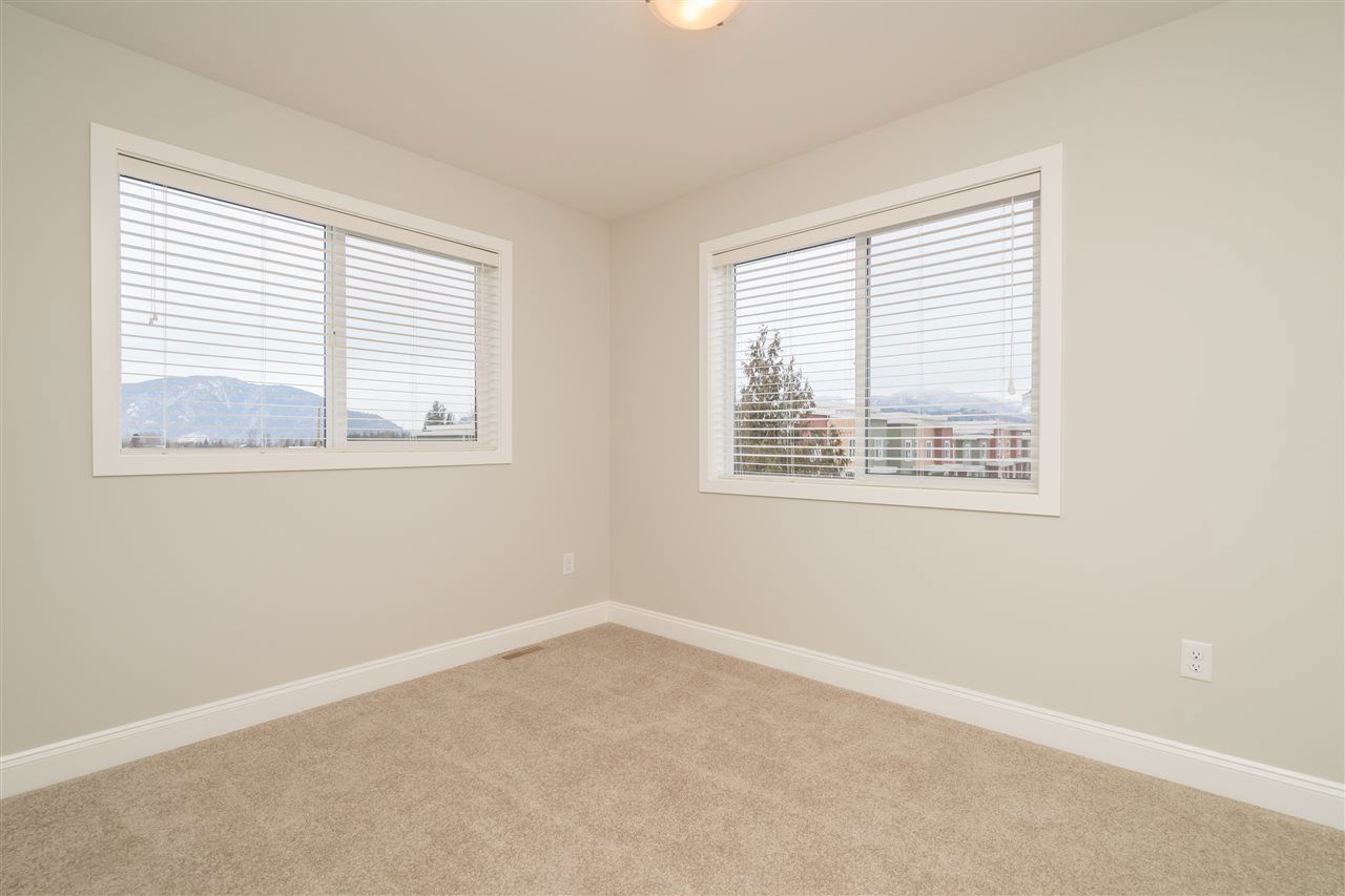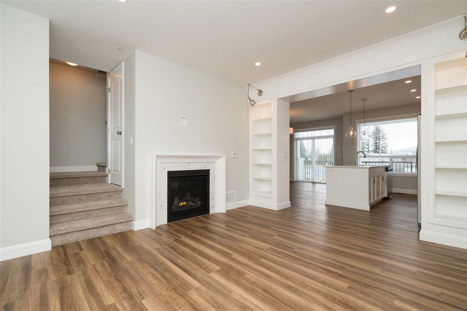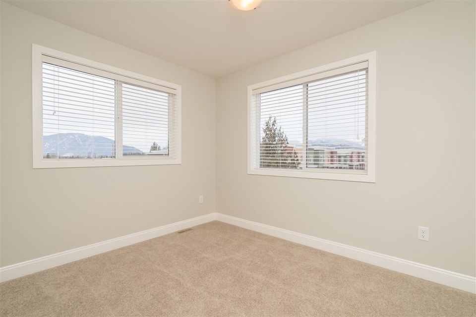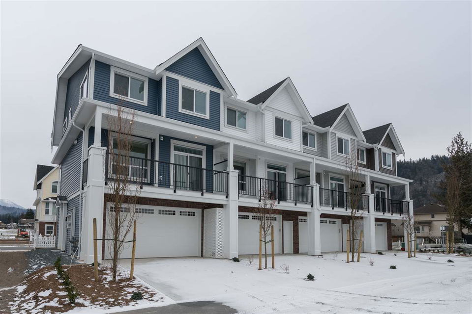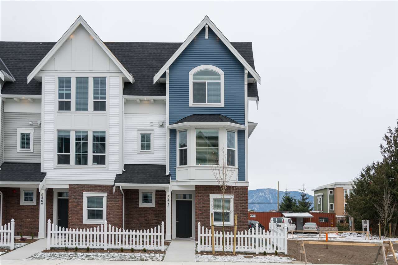 Gorgeous WEST FACING END UNIT w/ large covered patio- enjoy those sunsets all year round! Brand new in 2018, this NON-STRATA 3 bedroom & 3 bathroom home is located steps from the Vedder River Trail, Webster Park, Unsworth Elementary, & the UFV campus! Main floor features a modern open concept kitchen w/ stainless steel appliances incl. a gas range! Stylish white shaker cabinets & quartz counters. Living room w/ electric fireplace & built in bookshelves. 3 bedrooms up, master w/ vaulted ceilings & ensuite w/ dual vanities, glass walk in shower, & heated tile floors. Main entry level w/ heated tile floors and den! DOUBLE CAR GARAGE & full driveway- no more parking issues! Price is + GST but owner occupiers don’t pay PTT!
