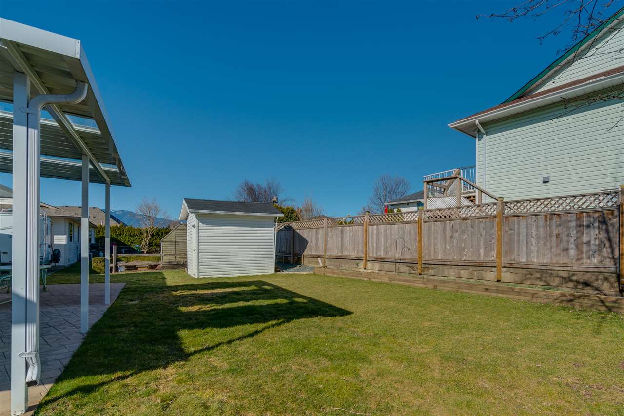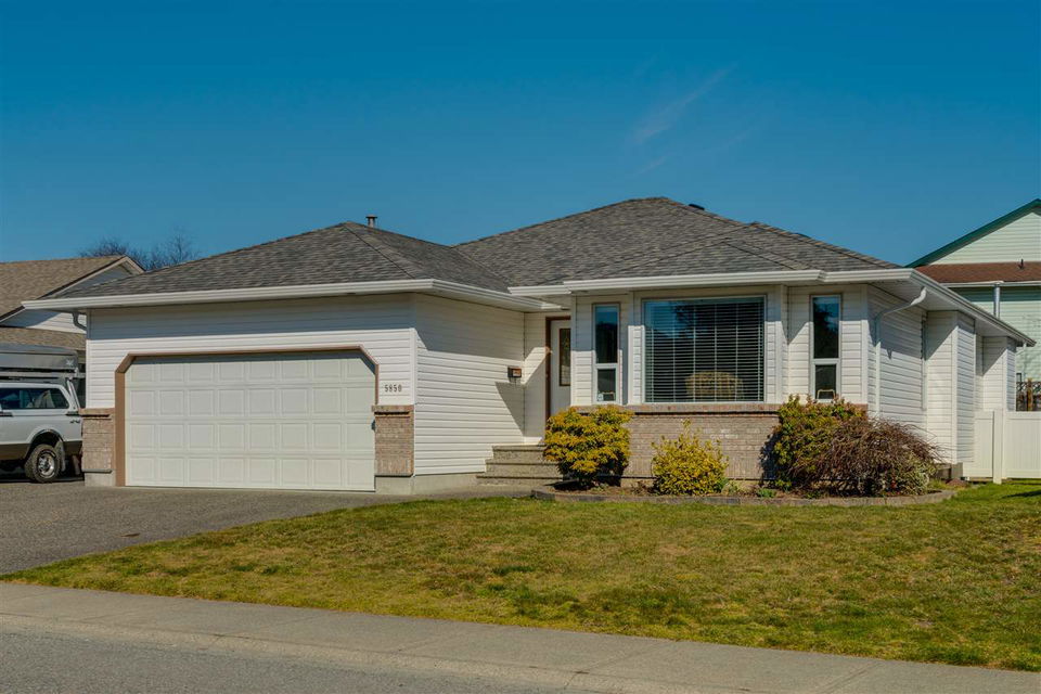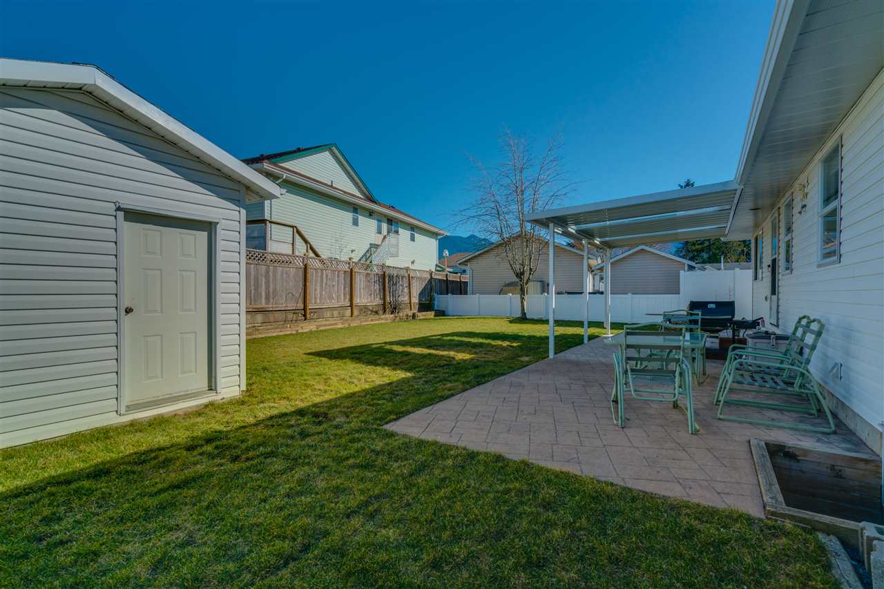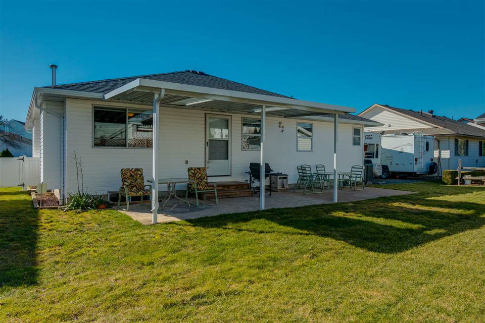 Great SARDIS location! This RANCHER w/ FULL BASEMENT & RV PARKING is located in walking distance to the Vedder River, UFV, Garrison Crossing, & all levels of schools! Manicured 6662 sq ft lot with fenced yard, large stamped concrete covered patio w/ mtn views, & a storage shed. Updated kitchen (2011) w/ shaker cabinets, GRANITE counters, SS appliances, pantry cabinets, & pot lighting. Main bath remodelled in 2014 & features a glass walk in shower! Upgraded flooring, light fixtures, & paint throughout. ROOF is 2010, gutters 2017, gas hot water tank 2017, & a new FURNACE/AC/ & HRV SYSTEM in 2011! Main floor living PLUS a partially finished bsmt w/ MEDIA ROOM w/ dry bar (wired for sound), bathroom, WORKSHOP area, 4th bdrm, & storage GALORE! Floorplans available- call for more info!