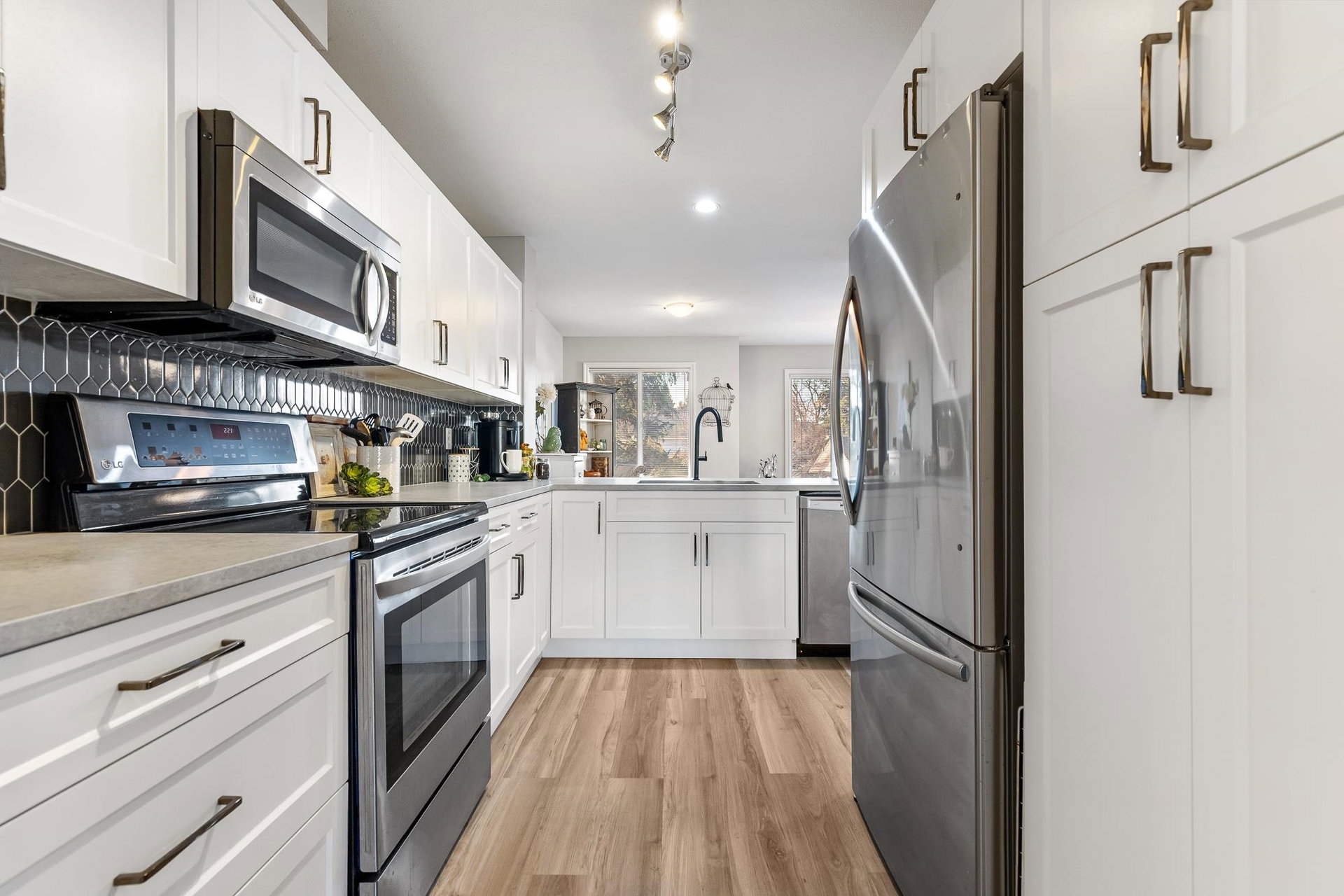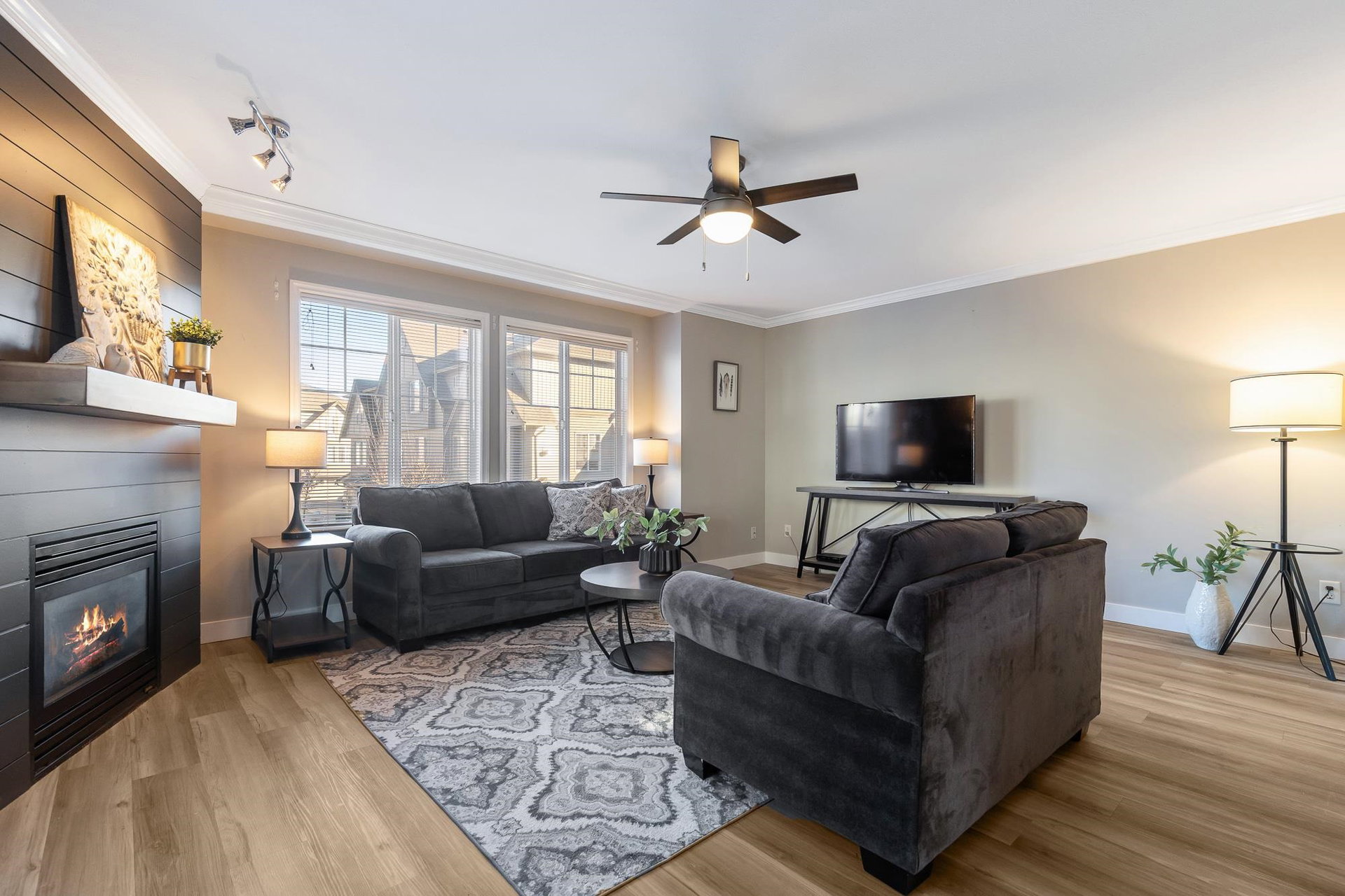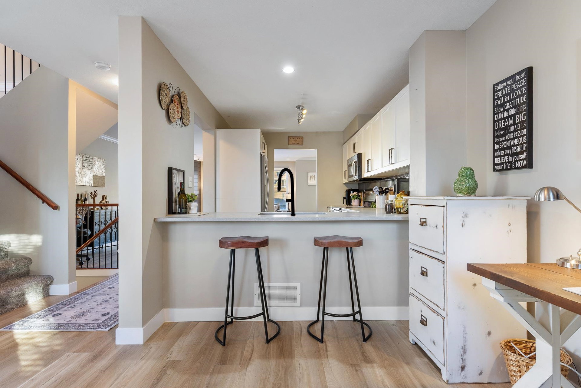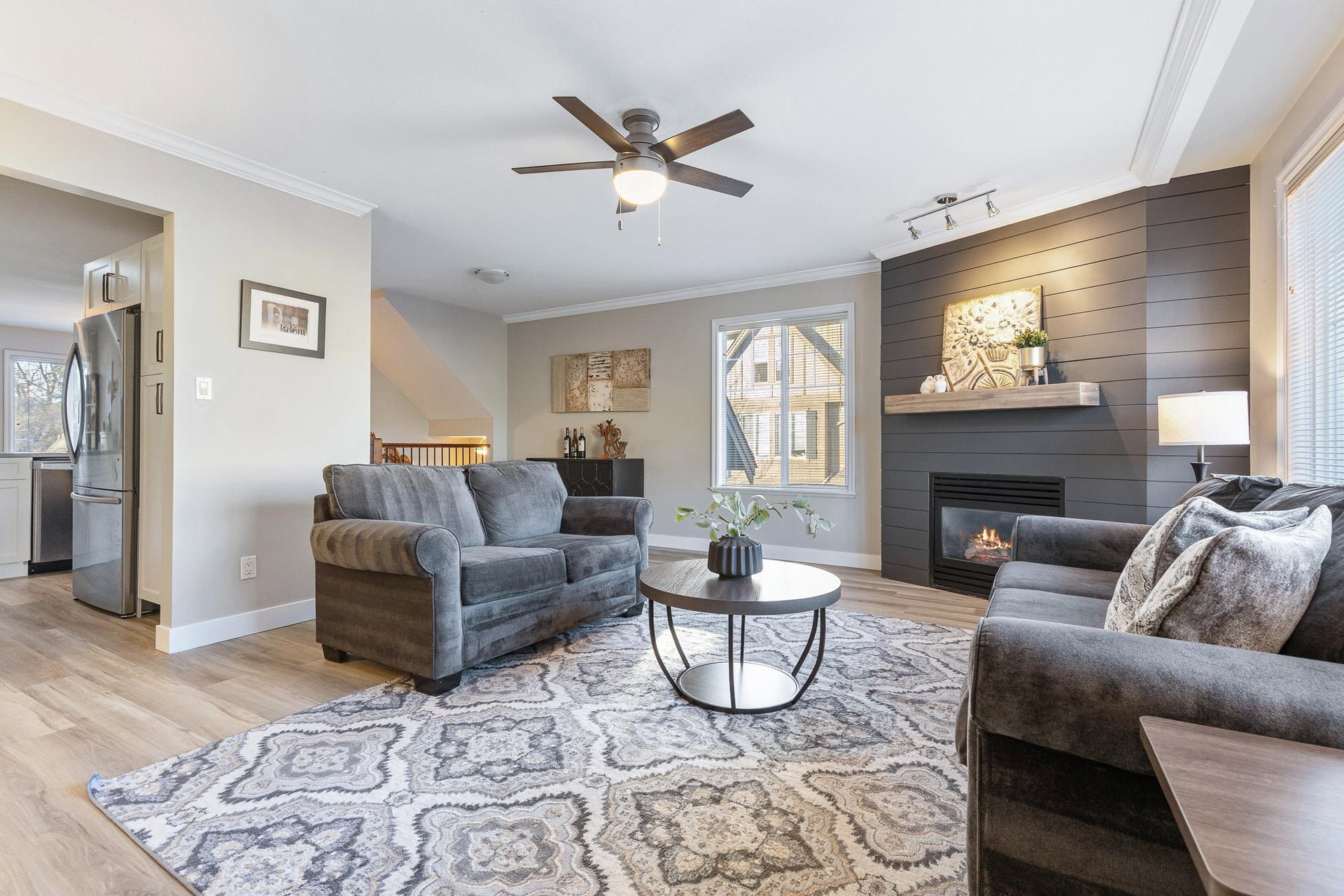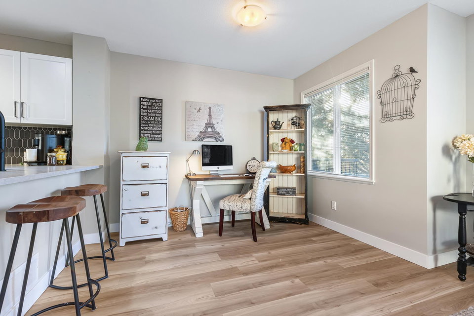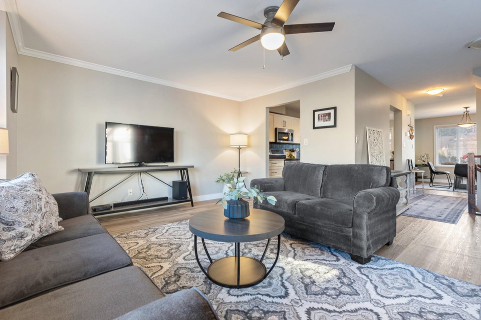 Fantastic 3 bed END UNIT townhouse in a PRIME central location! The stunning kitchen features white soft-close shaker cabinets w/TONS of storage, SS appliances, quartz countertops, chic backsplash & eating bar. Seamlessly flowing into the SPACIOUS living area w/shiplap gas f/p & large windows allowing for AMPLE natural light throughout. The cozy balcony is just off the lovely dining area and includes a gas BBQ hookup! Upstairs offers 3 generous bedrooms — the primary boasts a 3 pc ensuite w/W.I.C! The other 2 rooms feature window seats & sizable closets, plus laundry upstairs. Downstairs includes a 2 pc bath & flex space IDEAL for a rec room, office, or guest room, PLUS a cute fenced yard PERFECT for young families. A SUPERB place to grow, gather, and call home.