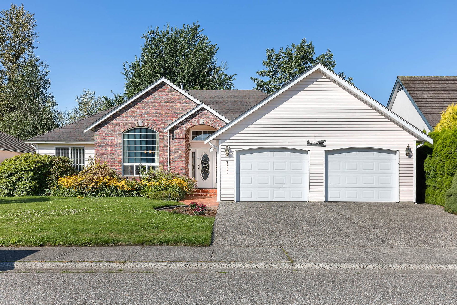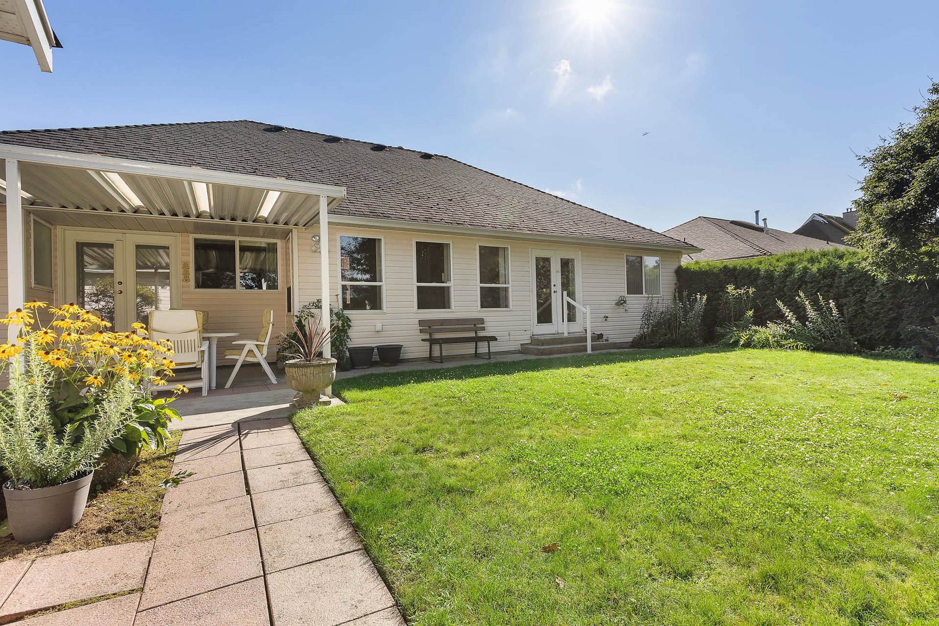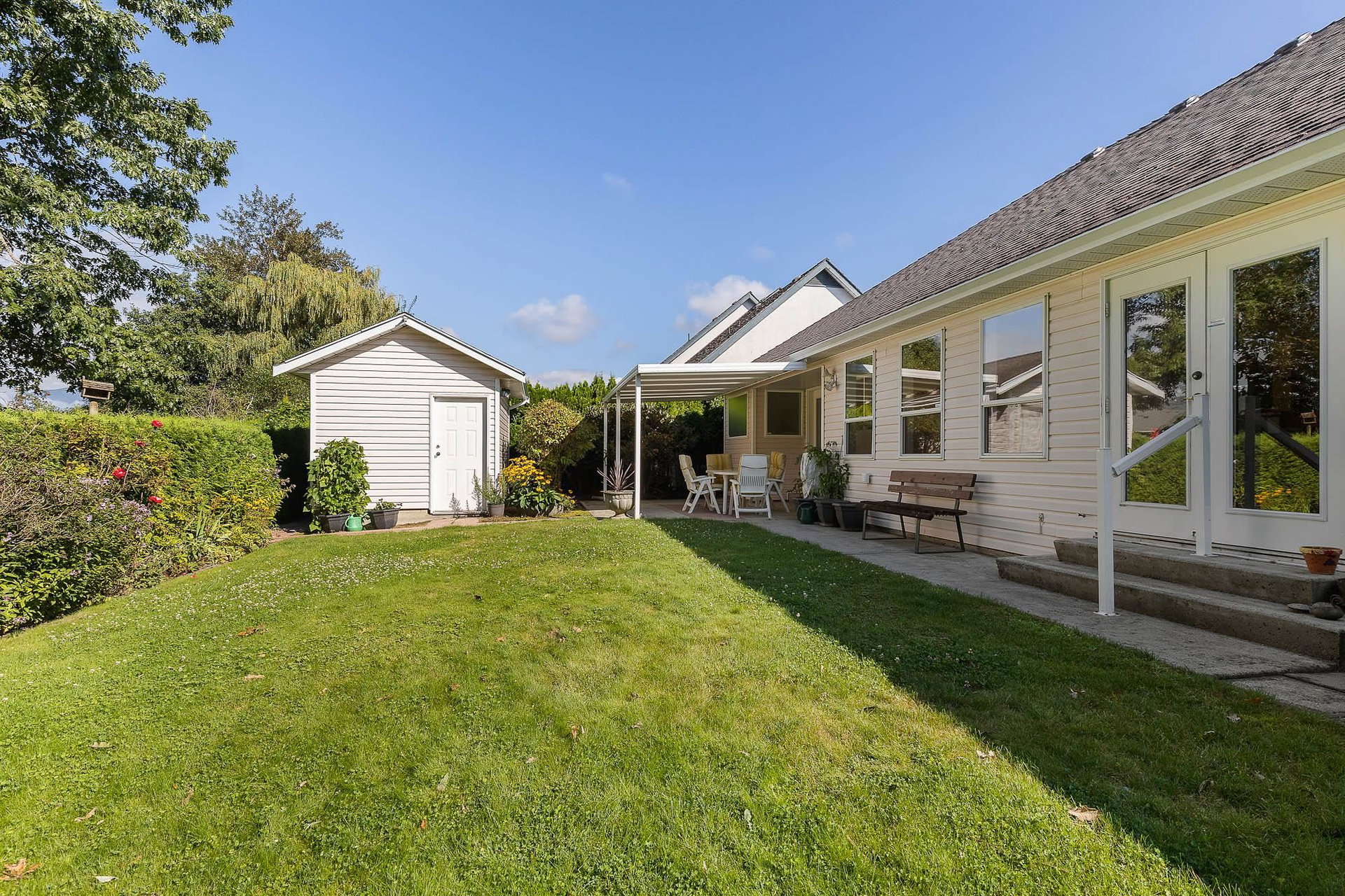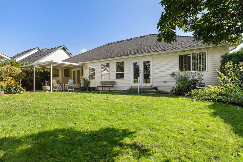 IMMACULATE RANCHER in highly desirable location backing Luckakuck Trail on the quiet culdesac of Sapphire Crsnt! Steps to malls, drs, restaurants, public transpo- this is the MOST convenient Sardis location! Customed designed, this sprawling 1,624 sq ft home has amazing VAULTED CEILINGS throughout, giving it a grand feeling & allowing ample natural light. The tranquil setting w/ mature trees & greenspace behind allows for a PRIVATE yard w/ no neighbors visual. Enjoy a covered patio off primary suite, fenced yard for the pets & pwrd 12×10 shed! Incredible layout w/ open concept kitchen, spacious living room w/ feat. gas f/p, ample storage, modern paint & fixtures. Oasis primary suite w/ w.i.c & 4 pc ensuite w/ separate soaker tub & walk in shower. Oversized dbl Garage & RV Parking possible!