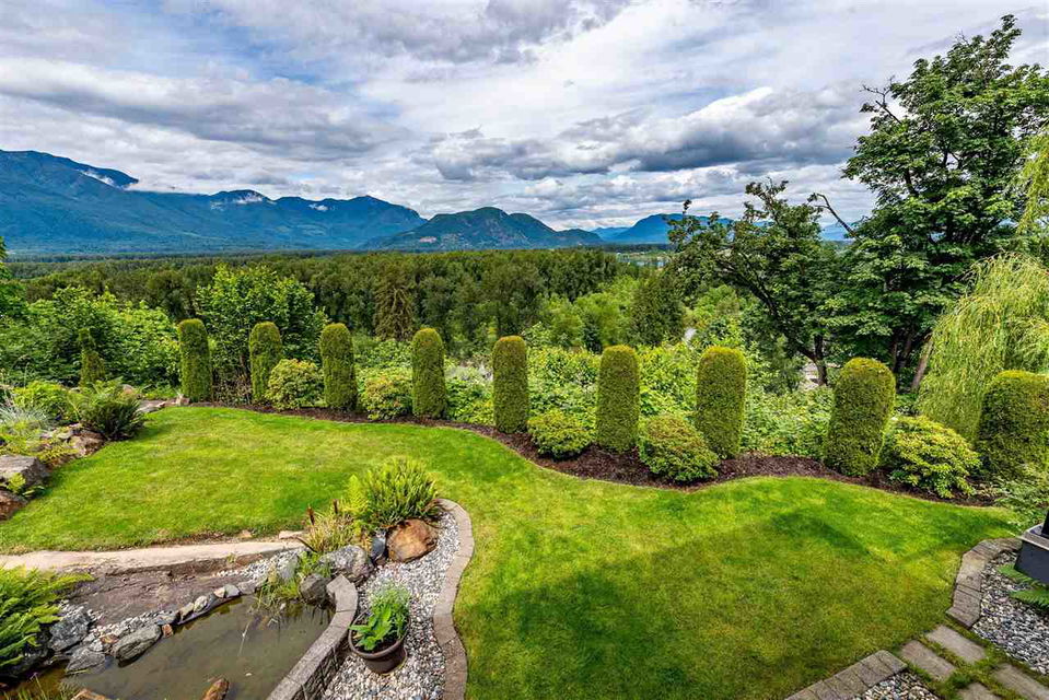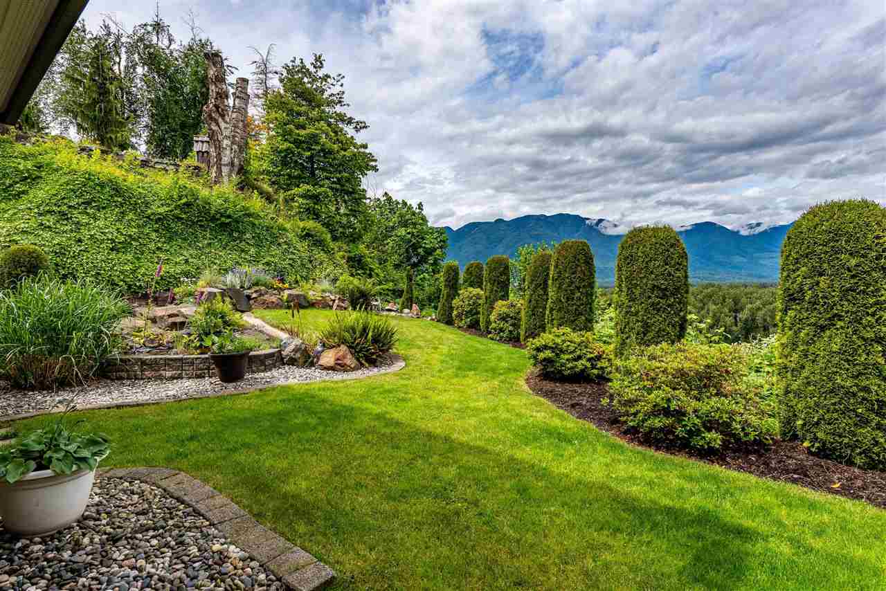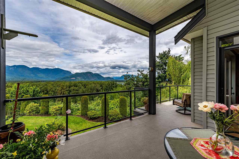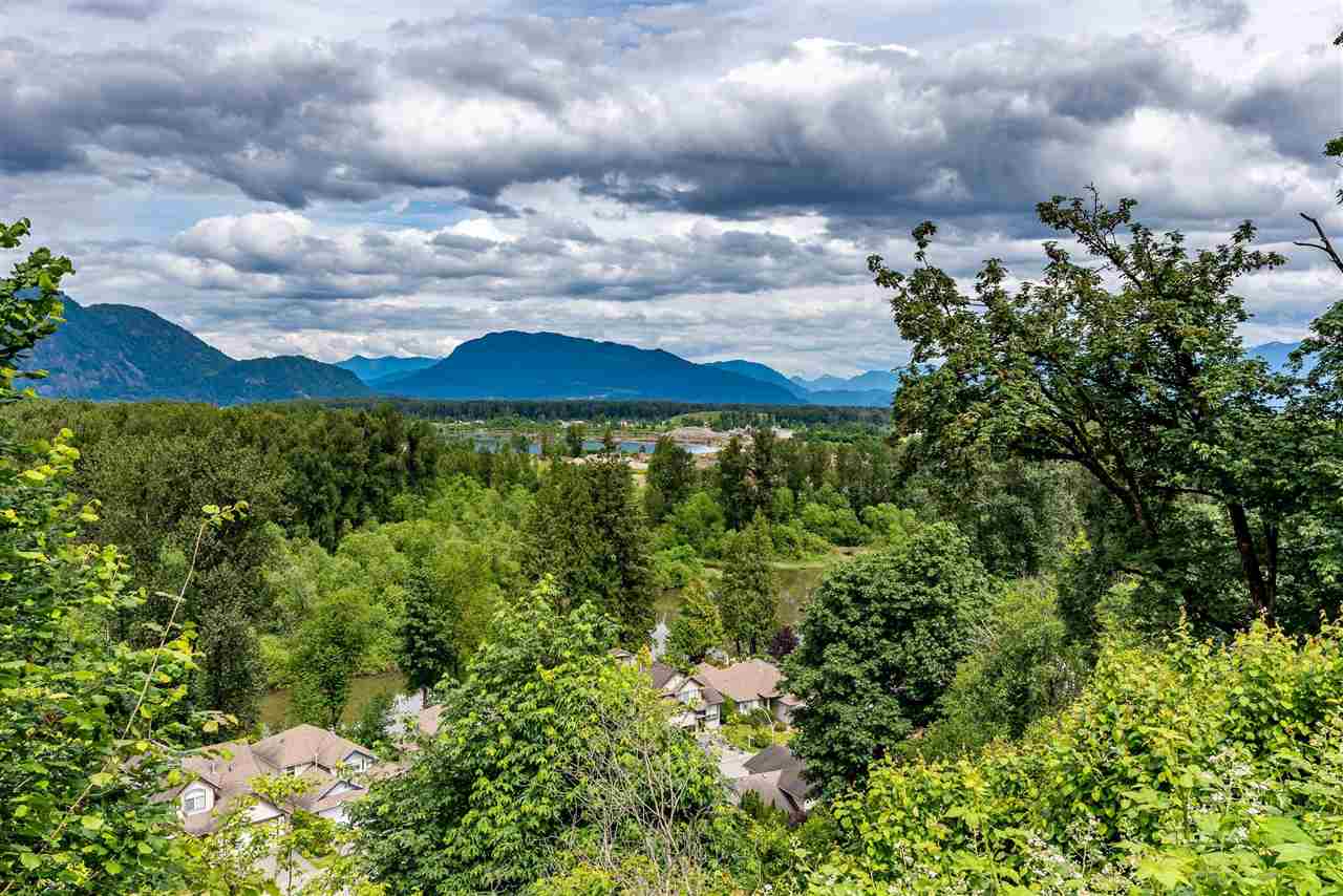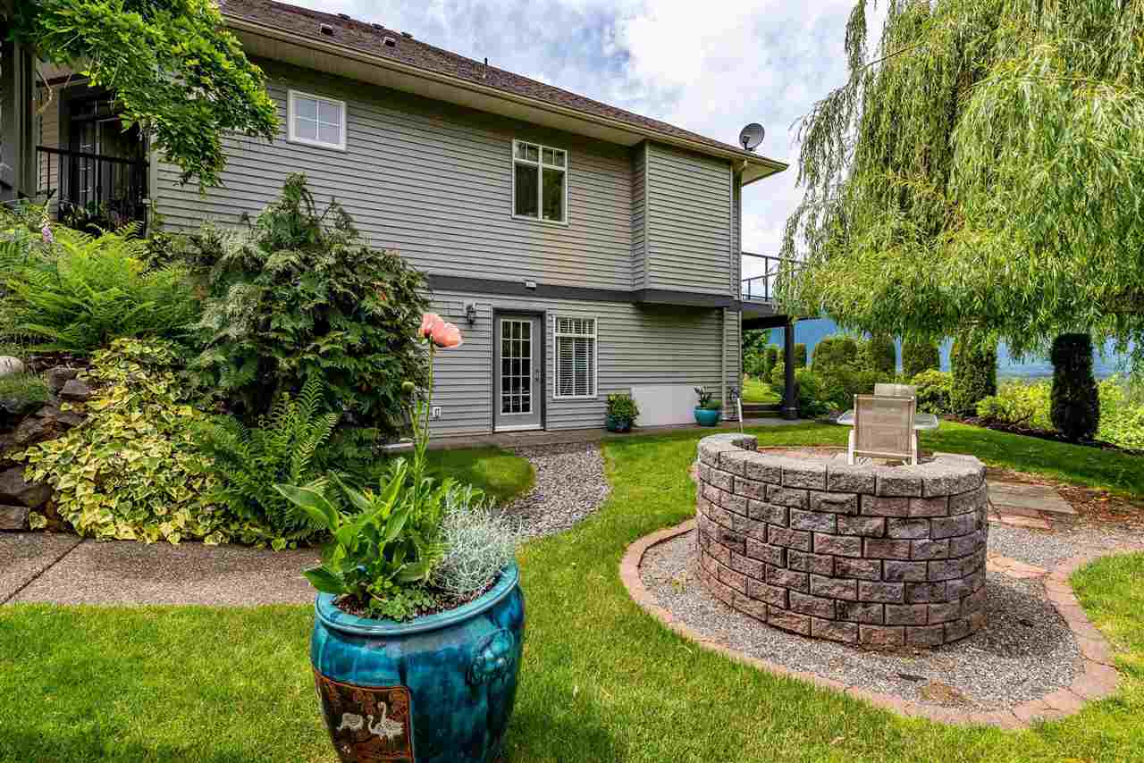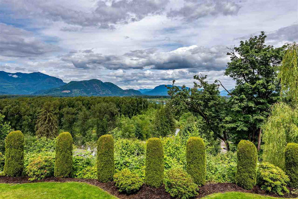 RIVER VIEW PROPERTY on a 1 ACRE LOT! Nestled down a private driveway on beautiful Chilliwack Mountain, this 3157 sq ft RANCHER W/ DAYLIGHT WALKOUT BASEMENT has been lovingly maintained & updated by the original owners. Grand living room w/ vaulted ceilings, gas fireplace, and floor to ceiling WINDOWS to take in the BREATHTAKING scenery. Open concept kitchen w/ maple cabinets, gas range, & oversized entertainment island. Large master bedroom on main w/ private ensuite & walk in closet. Basement w/ 3 guest bedrooms, full bathroom, family room, and a roughed in wet bar area- excellent space for a man cave, teen hangout, or potential INLAW SUITE! Immaculately kept grounds w/ privacy hedging, perennials, wisteria, & willow trees to enjoy. This is truly a gem- a unique oasis!