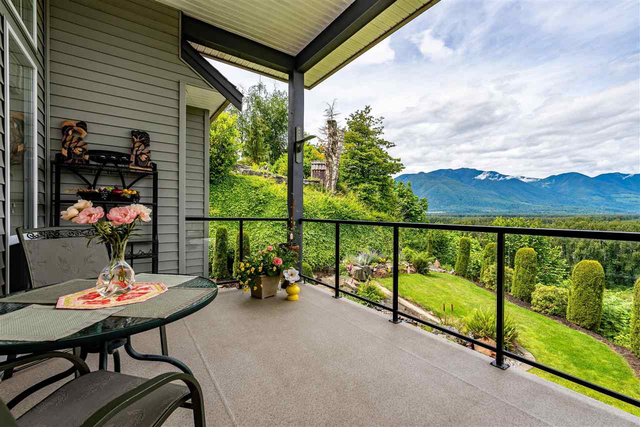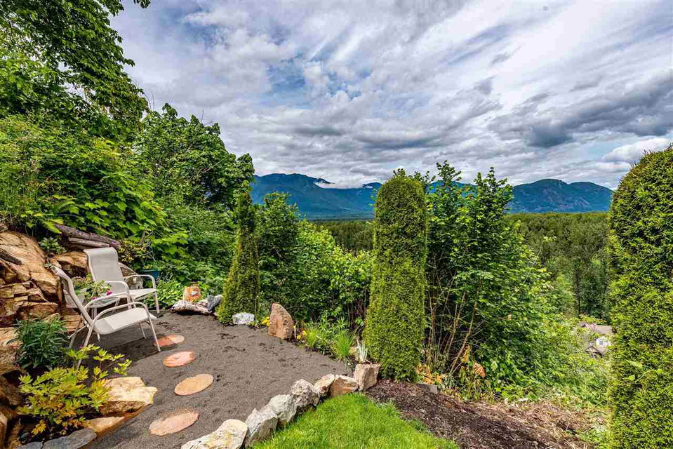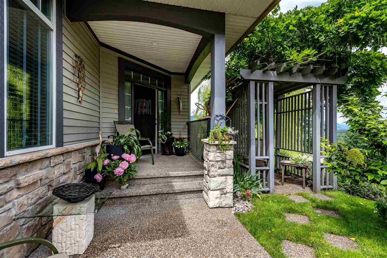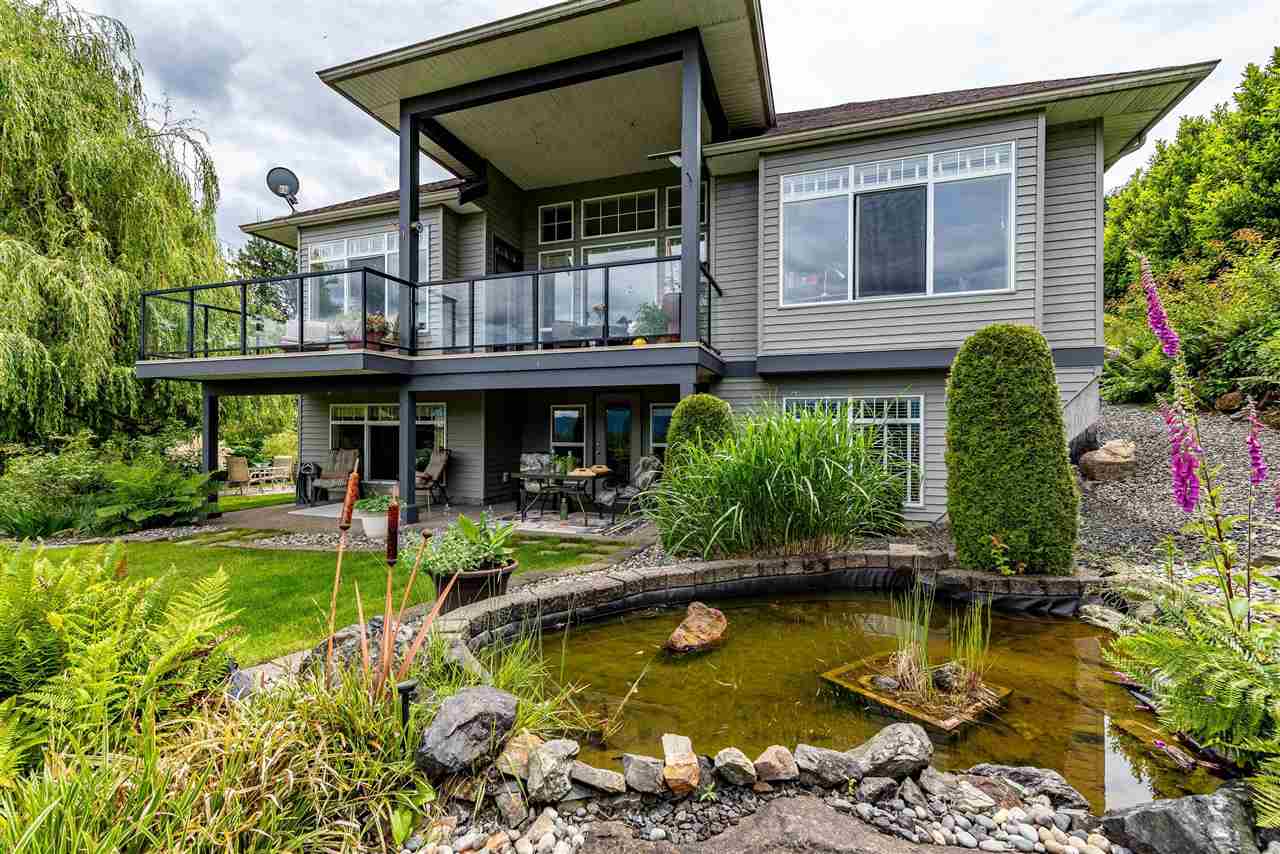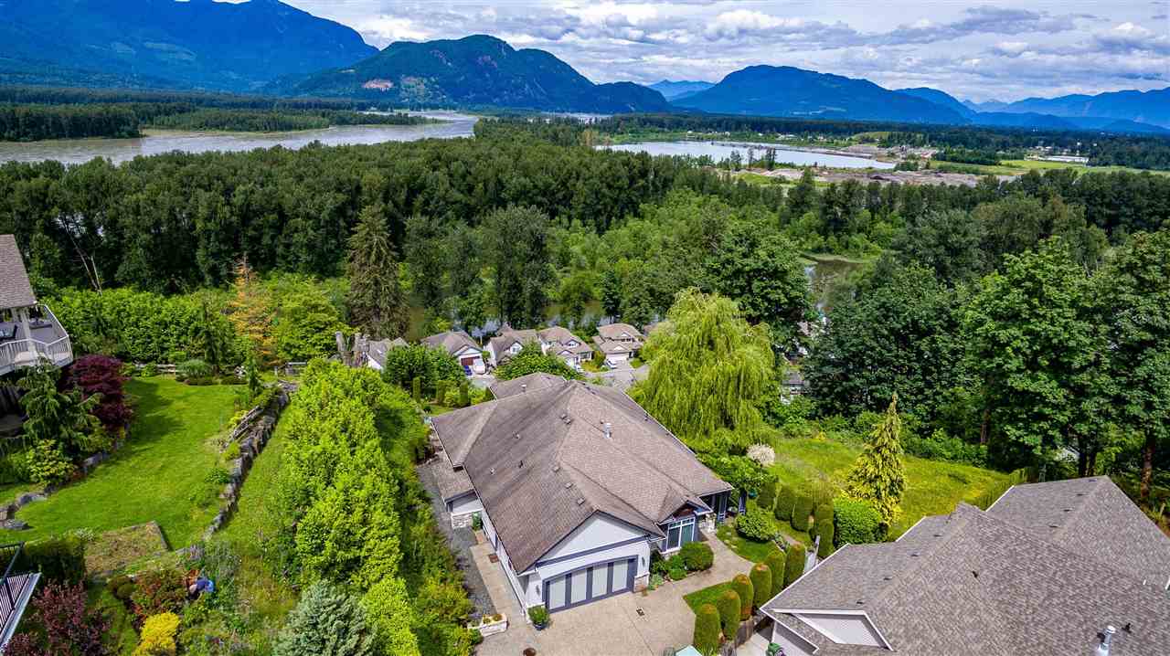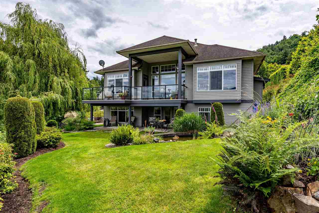 RIVER VIEW PROPERTY on a 1 ACRE LOT! Nestled down a private driveway on beautiful Chilliwack Mountain, this 3157 sq ft RANCHER W/ DAYLIGHT WALKOUT BASEMENT has been lovingly maintained & updated by the original owners. Grand living room w/ vaulted ceilings, gas fireplace, and floor to ceiling WINDOWS to take in the BREATHTAKING scenery. Open concept kitchen w/ maple cabinets, gas range, & oversized entertainment island. Large master bedroom on main w/ private ensuite & walk in closet. Basement w/ 3 guest bedrooms, full bathroom, family room, and a roughed in wet bar area- excellent space for a man cave, teen hangout, or potential INLAW SUITE! Immaculately kept grounds w/ privacy hedging, perennials, wisteria, & willow trees to enjoy. This is truly a gem- a unique oasis!