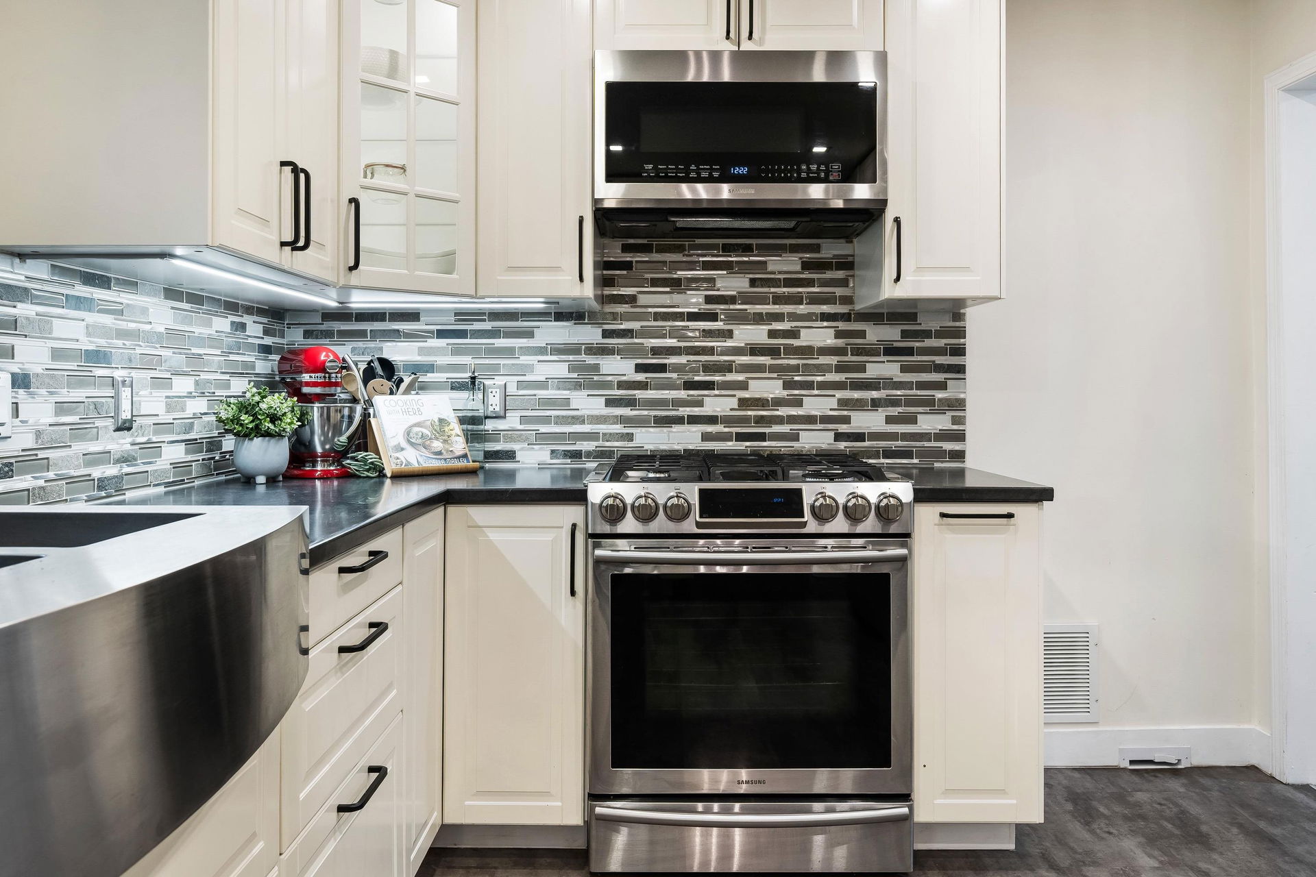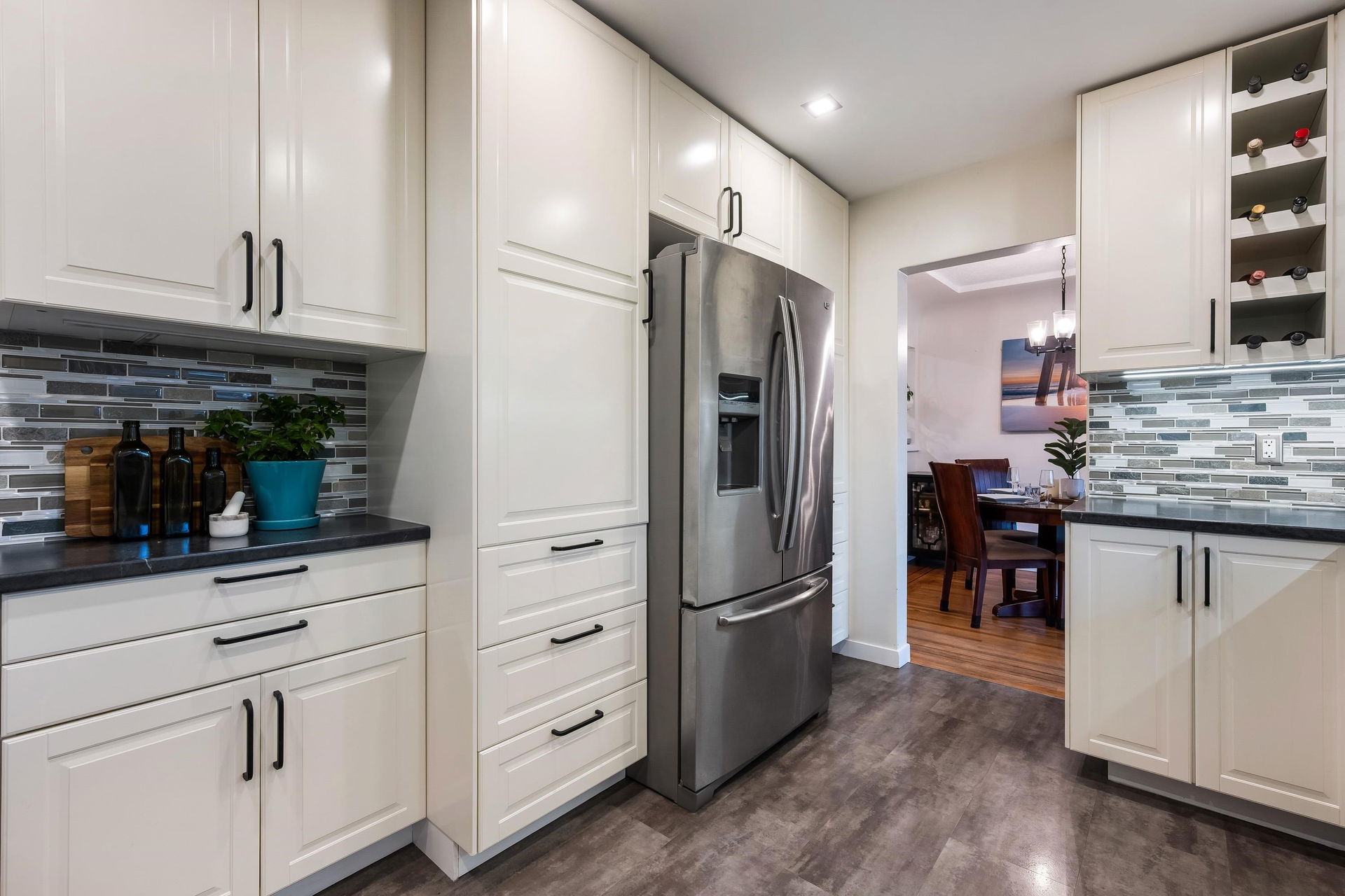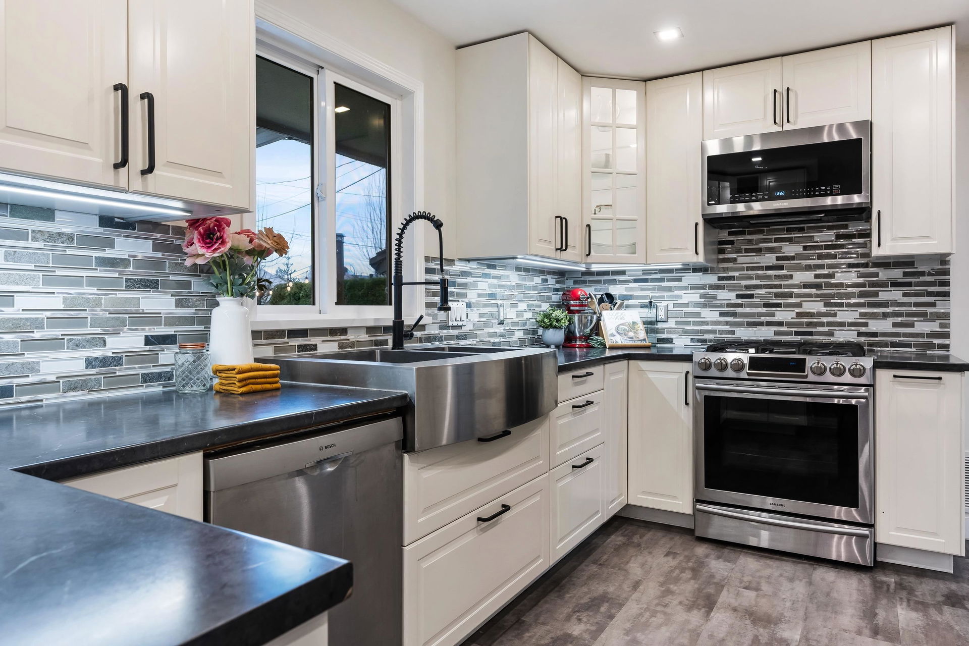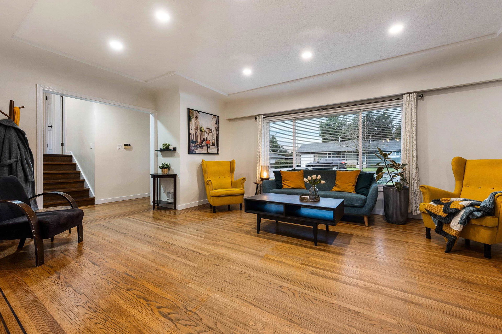 TURN KEY FAMILY HOME in a walkable friendly location near CSS and Kinsmen Park! This renovated 3 bed, 1 bath, plus rec room home has a SPECTACULAR family layout with ample living spaces for everyone to have SPACE. Level entry floor with updated kitchen w/ white cabinets, custom pullouts, SS appliances, SS afrm sink, glass tile backsplash- all looking out over your MANICURED FENCED BACKYARD complete with built in gas firepit. Easy access off the dining area, this is a convenient layout for those with kids and pets! 2022 furnace, 2016 AC, and 2022 Hot Water on Demand. 71′ frontage with 2 DRIVEWAYS for added parking PLUS lane access for added future possibilities for shop/carriage suite. Modern renovations with the 50’s charm of coved ceilings and inlay hardwood floors- the best!